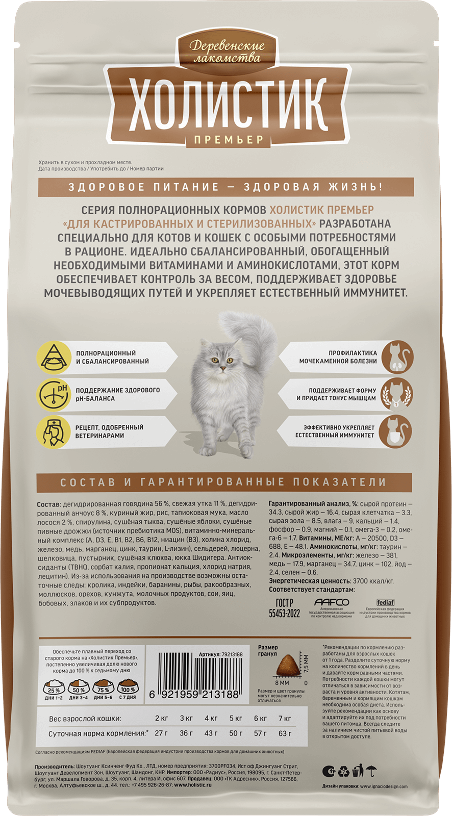 Серия полнорационных кормов «Холистик Премьер. Для кастрированных и стерилизованных» разработана специально для котов и кошек с особыми потребностями в рационе. Идеально сбалансированный, обогащенный необходимыми витаминами и аминокислотами, этот корм обеспечивает контроль за весом, поддерживает здоровье мочевыводящих путей и укрепляет естественный иммунитет.