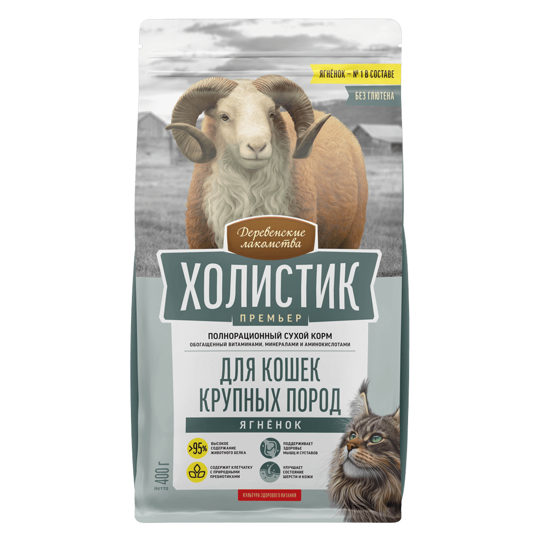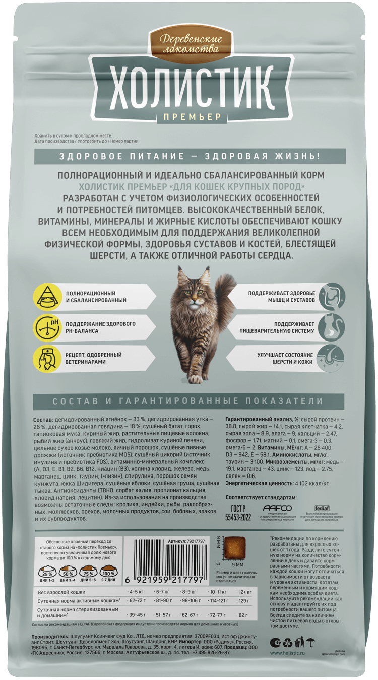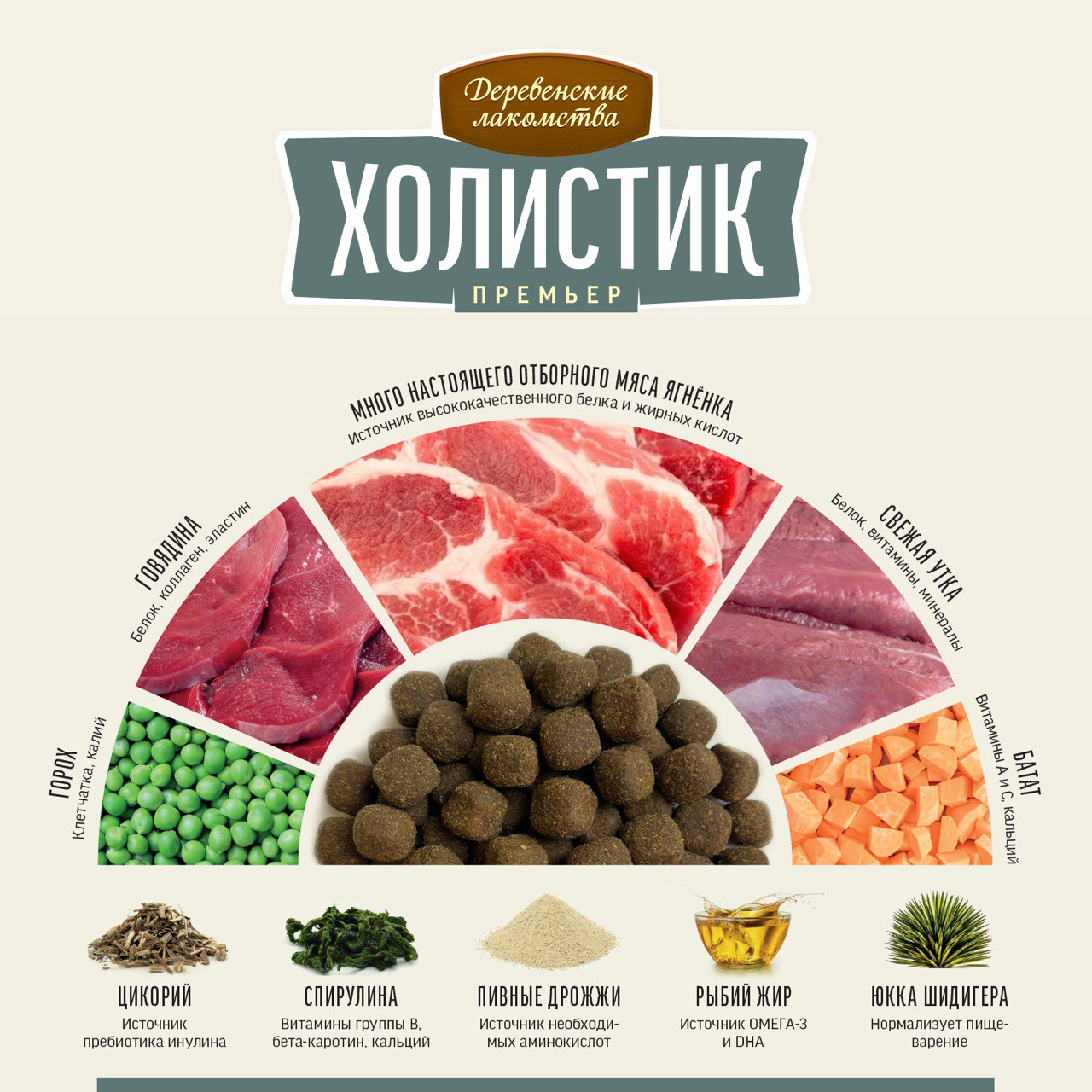 Дегидророваный ягненок 33%, дегидрированая утка 26%, дегидрированая говядина 18%, сушеный батат, горох, тапиоковая мука, куриный жир, растительные пищевые волокна, рыбий жир (анчоус), говяжий жир, гидролизат куриной печени, цельное сухое козье молоко, сушеные пивные дрожжи (источник пребиотика MOS), витаминно-минеральный комплекс (A, D3, E, B1, B2,B6,B12, ниацин (В3), холина хлорид, железо, медь, марганец, цинк, таурин, L — лизин), пребиотики FOS, спирулина, порошок семян кунжута, экстракт Юкки Шидигера, сушеное яблоко, сушеная груша, сушеная тыква. Антиоксиданты (TBHQ, сорбат калия, пропионат кальция, хлорид натрия, лецитин). Из-за использования на производстве возможны остаточные следы: кролика, индейки, рыбы, ракообразных, маллюсков, орехов, молочных продуктов, сои, бобовых, злаков и их субпродуктов.