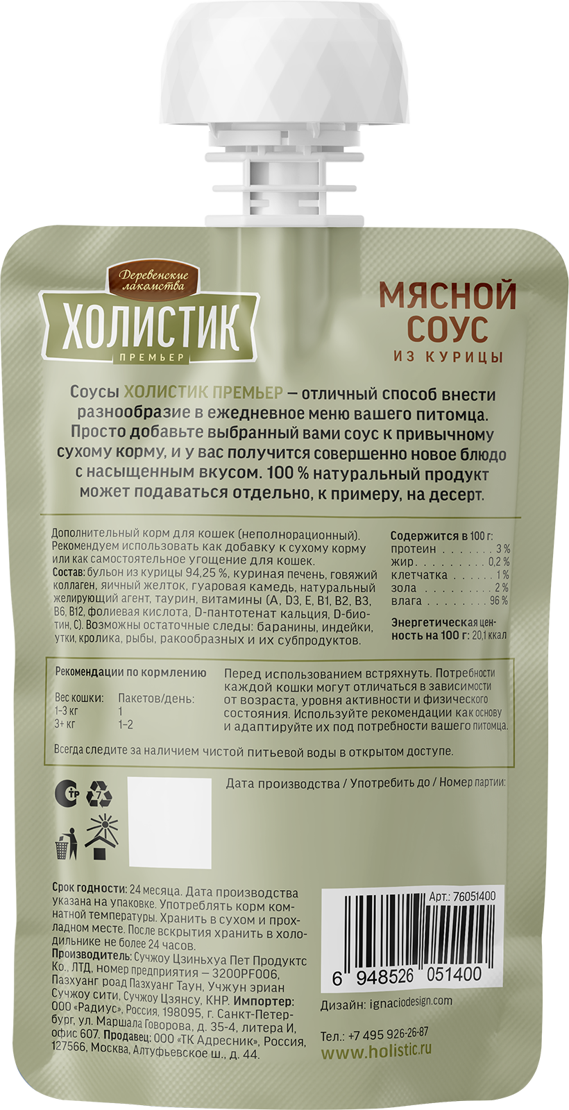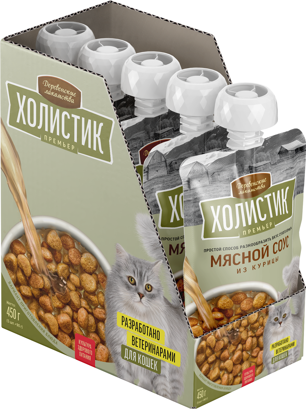 Соусы «Холистик Премьер» для кошек помогут разнообразить вкус повседневного корма. Выберите мясной соус из курицы от «Деревенских лакомств», обильно полейте им сухой корм, и новое блюдо с ярким вкусом готово. 100 % натуральный продукт может подаваться отдельно, к примеру, на десерт.