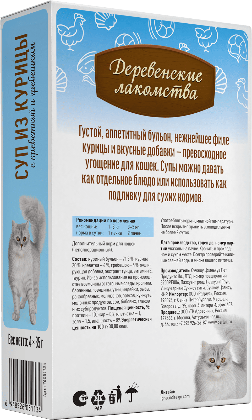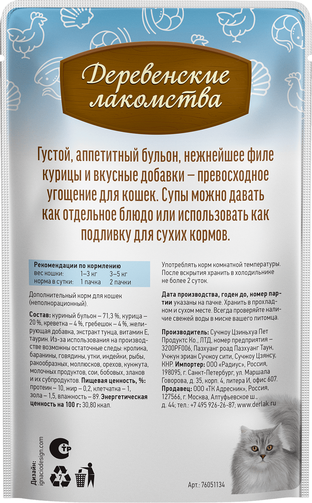 Состав: куриный бульон — 71,3%, курица — 20%, креветка — 4%, гребешок — 4%, желирующая добавка, экстракт тунца, витамин Е, таурин.