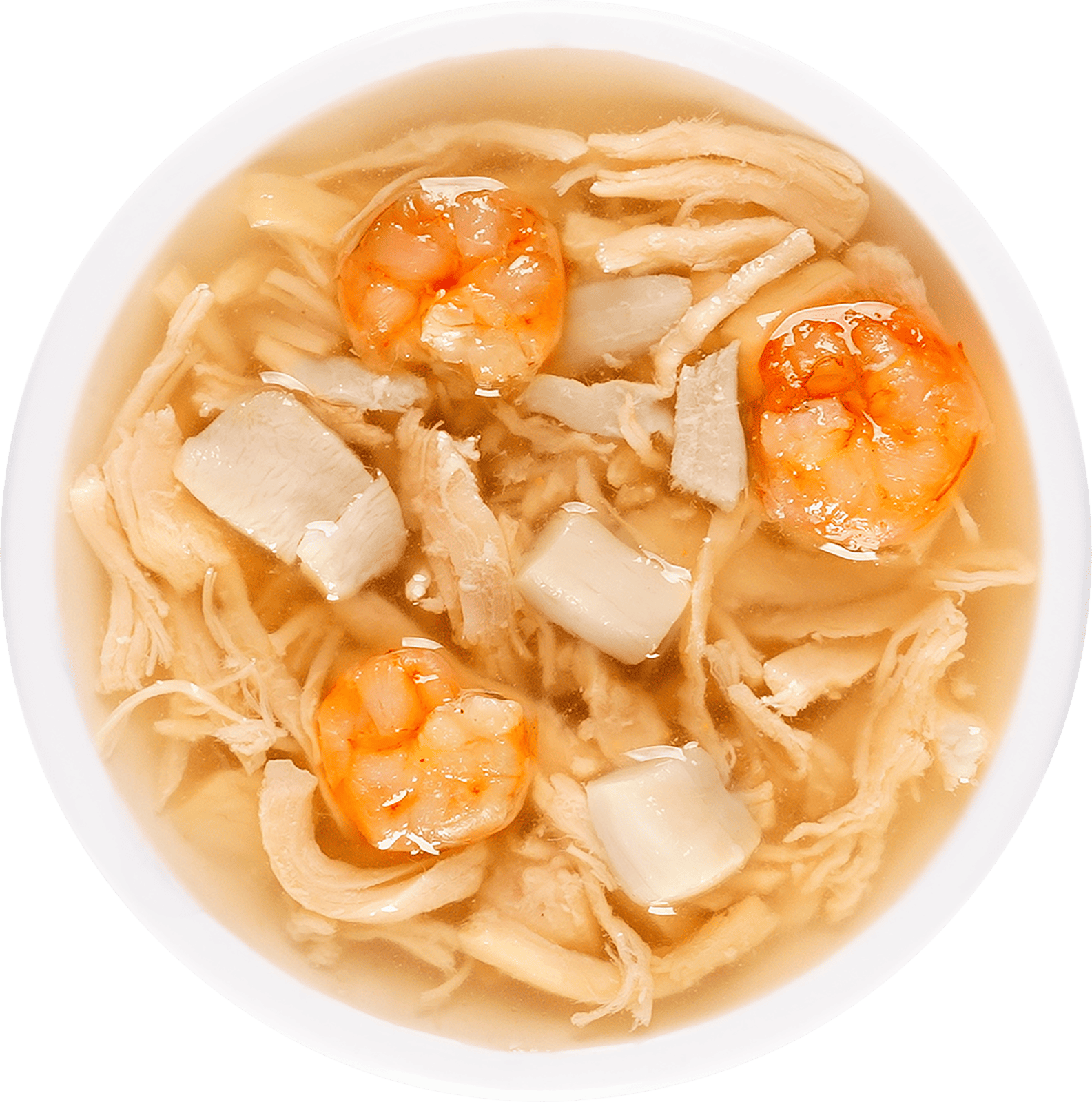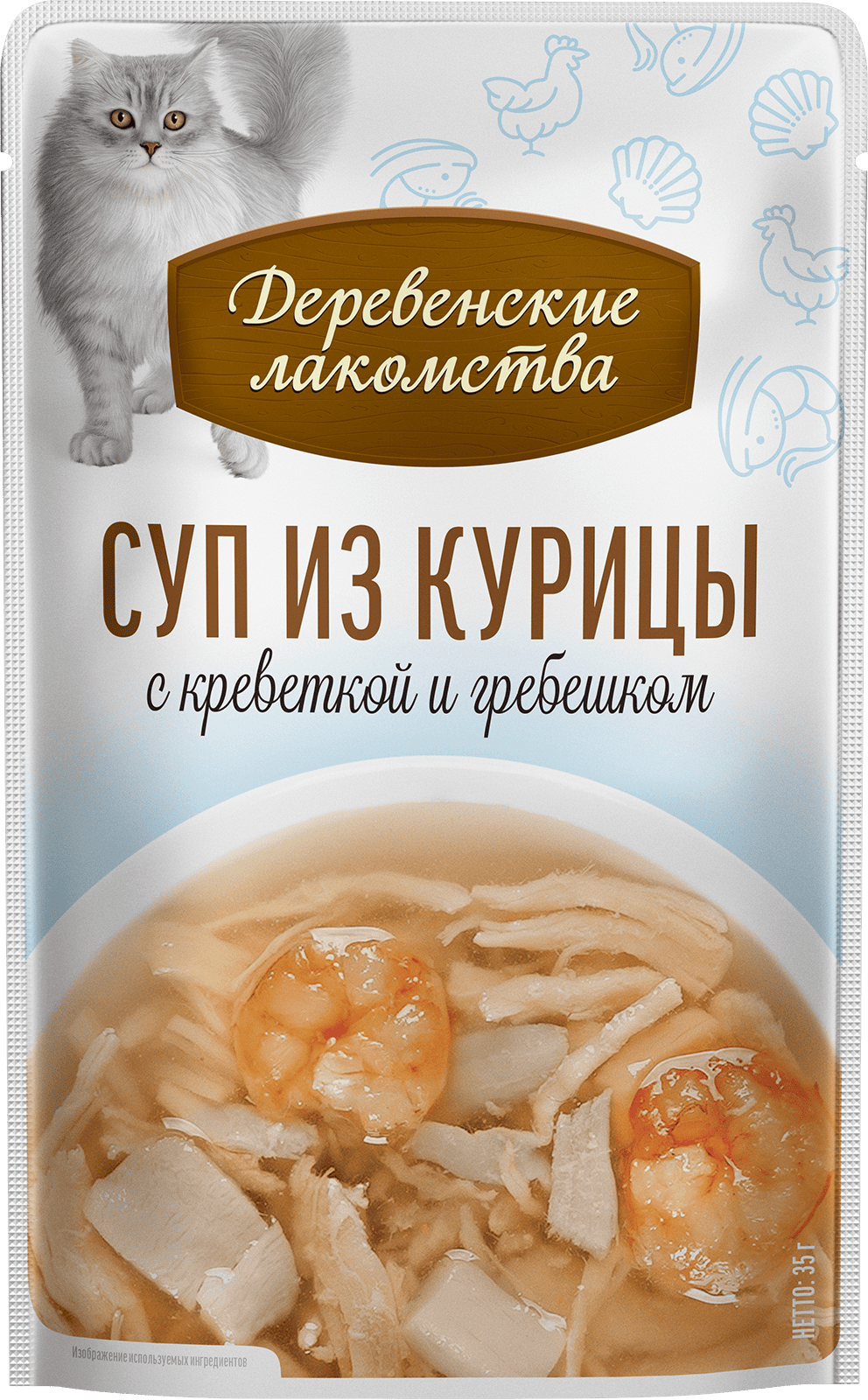 Суп из курицы с креветкой и гребешком разработан с учетом потребностей самых привередливых питомцев.
