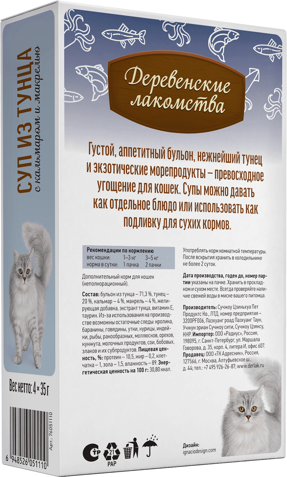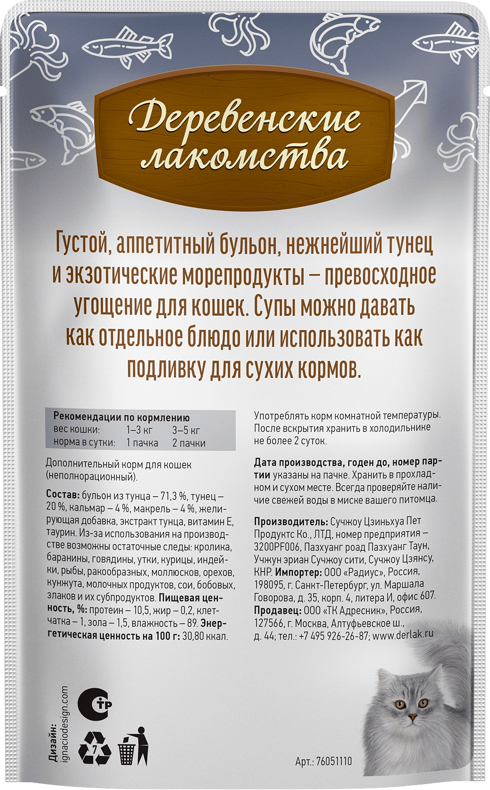 Приготовленный из натуральных ингредиентов, суп не содержит искусственных красителей, ароматизаторов и консервантов. Ароматный бульон помогает поддерживать водный баланс в организме кошки, он легко усваивается и подходит даже для кошек с чувствительным пищеварением. Суп от «Деревенских лакомств» — это не просто еда, это выражение вашей любви и заботы о вашем пушистом друге.