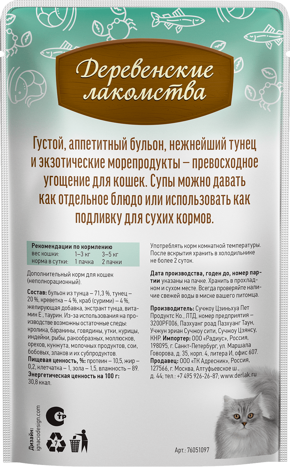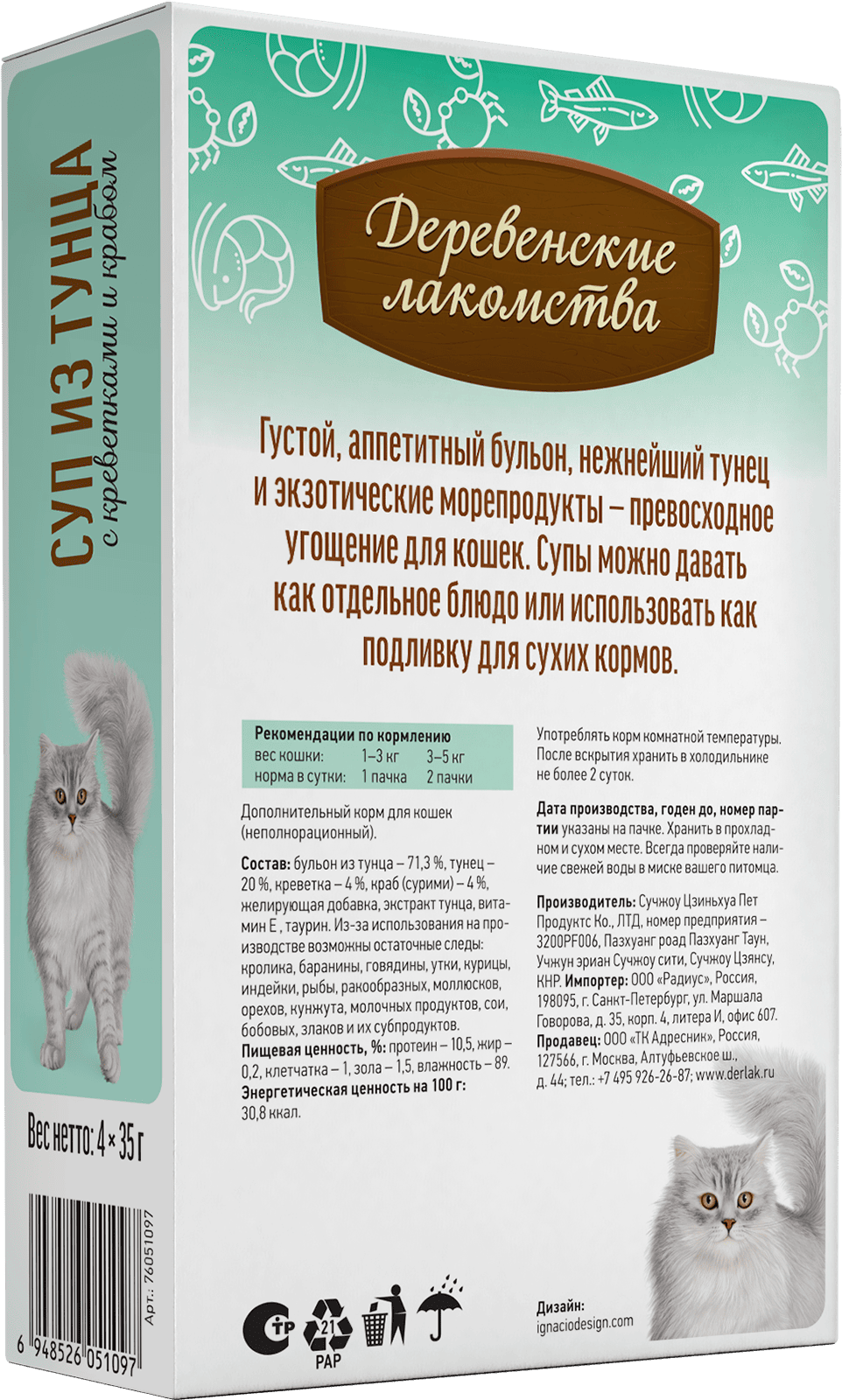 Насыщенный, манящий аромат густого бульона, в котором тают нежные кусочки тунца, сочные креветки и деликатное крабовое мясо, — настоящее пиршество для кошачьего гурмана. Бульон, обогащенный натуральными ингредиентами, легко усваивается и способствует поддержанию водного баланса в организме кошки. Побалуйте своего любимца этим восхитительным лакомством, предложив его как самостоятельное блюдо или добавив немного пикантной подливки к привычному сухому корму. Суп для кошек от «Деревенских лакомств" — это не просто еда, это выражение вашей любви и заботы о вашем пушистом друге.