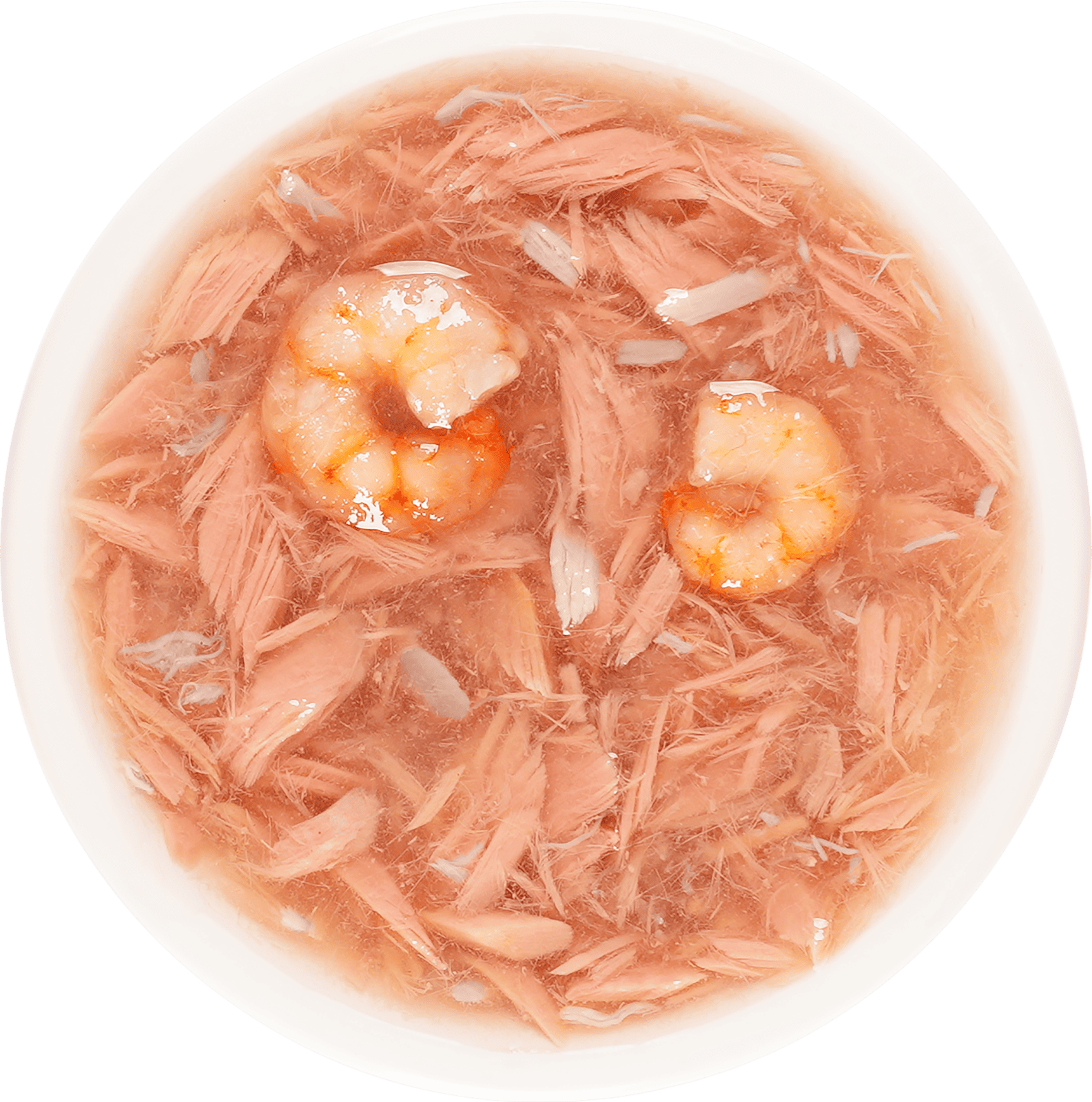 Состав: бульон из тунца — 71,3%, тунец — 20%, креветка — 4%, краб (сурими) — 4%, желирующая добавка, экстракт тунца, витамин Е, таурин.