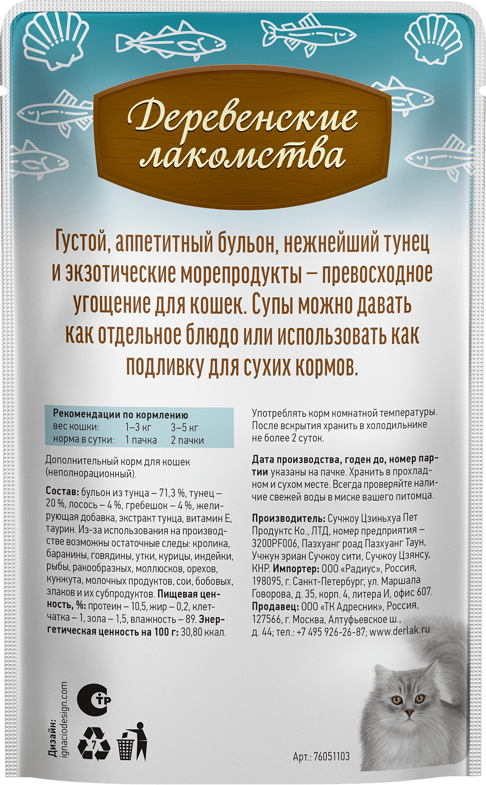 Состав: бульон из тунца — 71,3%, тунец — 20%, лосось -4%, гребешок-4%, желирующая добавка, экстракт тунца, витамин Е, таурин.