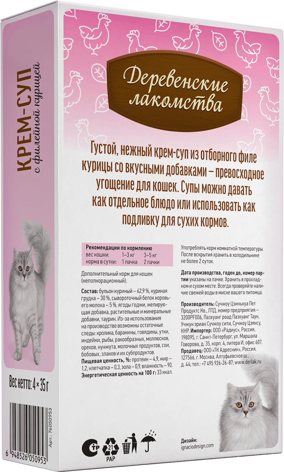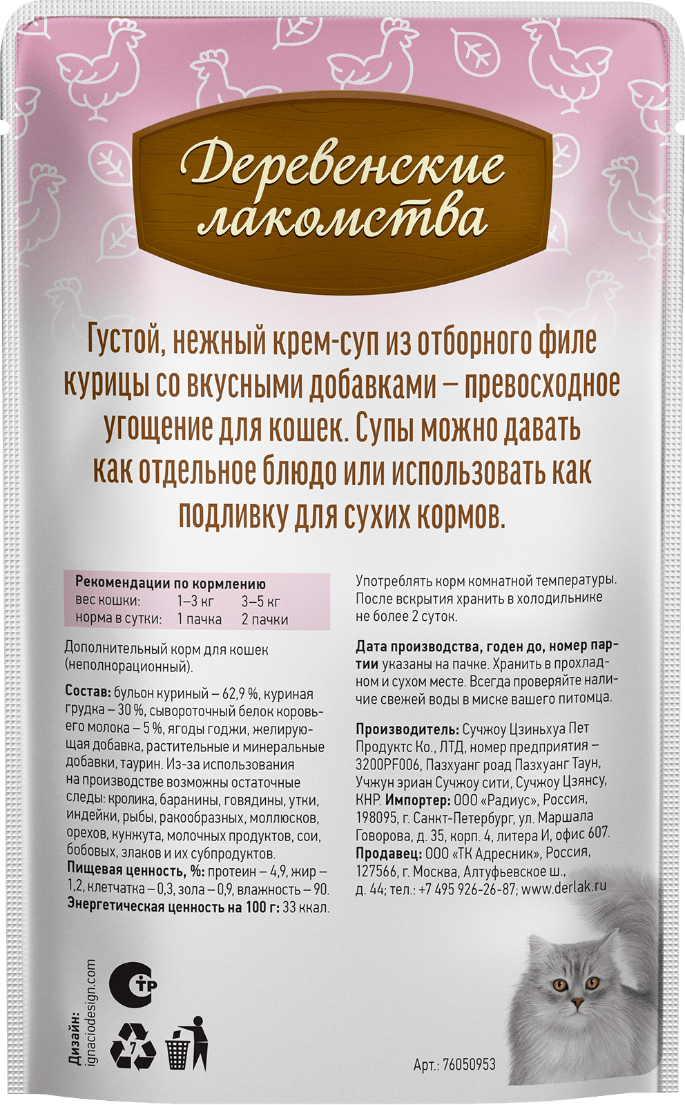 Лакомство сочетает в себе не только полезные, но и вкусные добавки, которые порадуют даже самых привередливых гурманов. Используйте наш суп как отдельное блюдо для угощения или как вкусную подливку к любимым сухим кормам вашей кошки. Нежная текстура и превосходный вкус делают этот крем-суп подходящим даже для самых юных или пожилых питомцев. Крем-суп для кошек от "Деревенских лакомств" — это не просто еда, это выражение вашей любви и заботы о вашем пушистом друге.