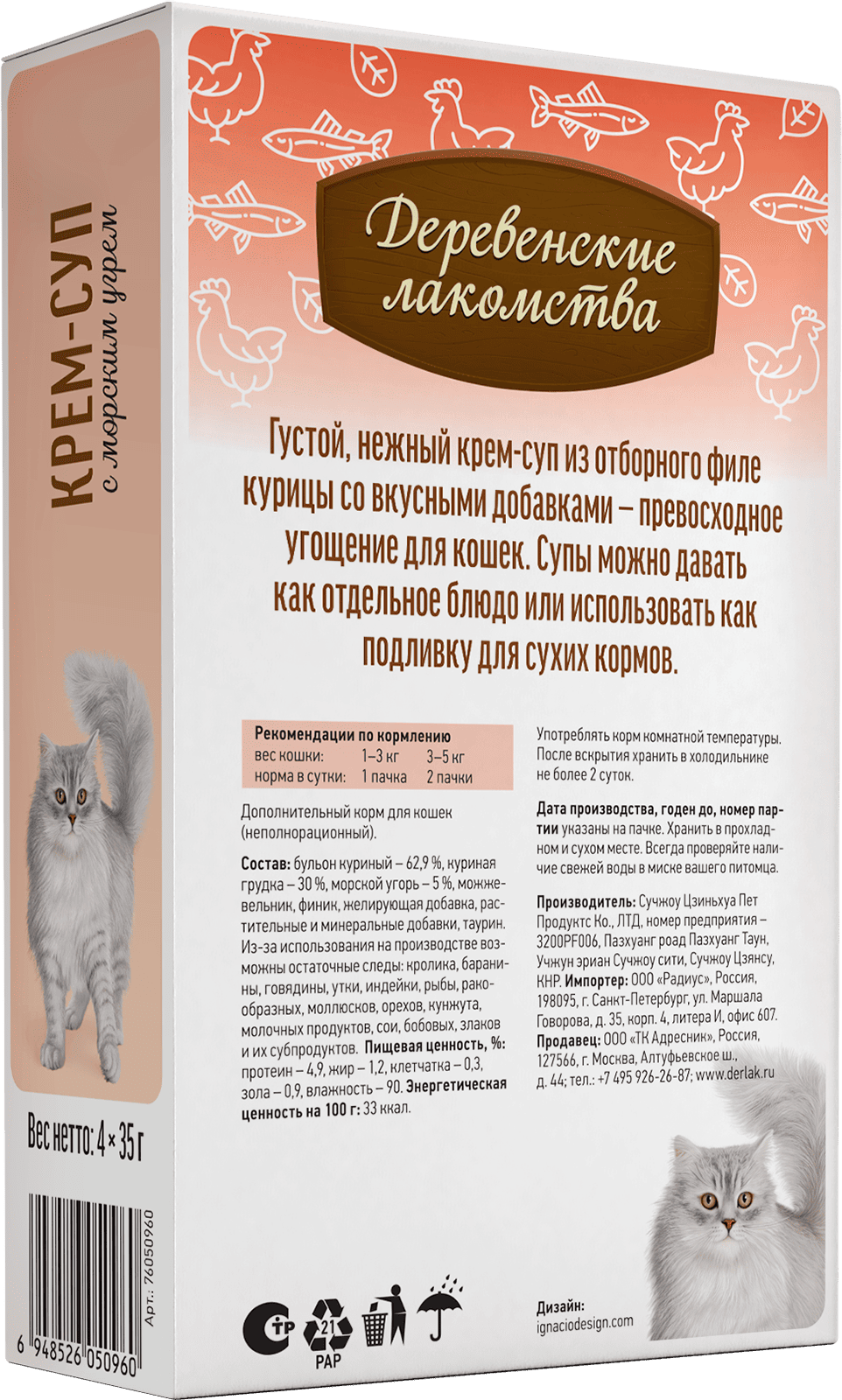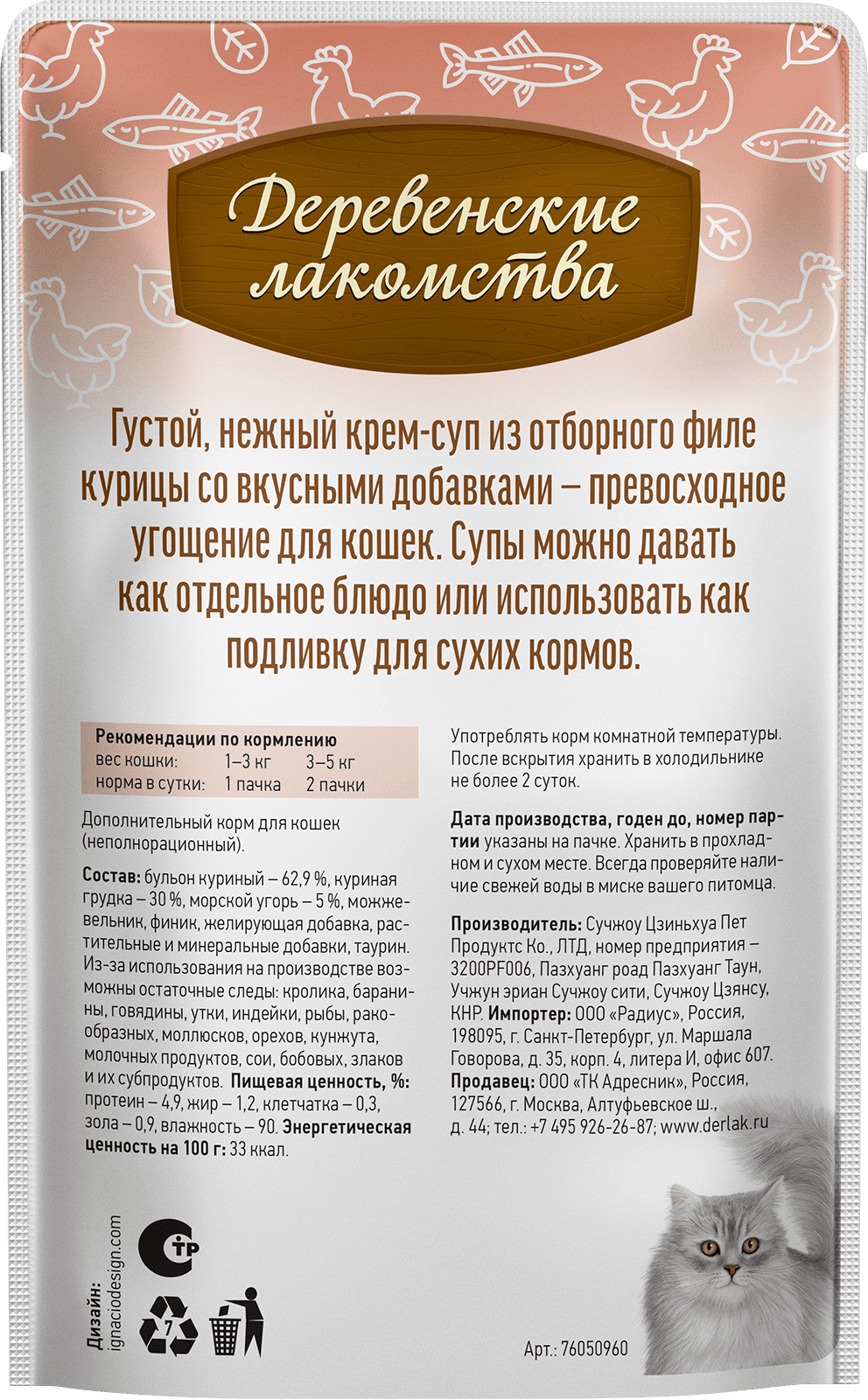 Идеально подходит как самостоятельное блюдо или подливка к сухому корму. Нежная текстура и превосходный вкус делают этот крем-суп подходящим даже для самых юных или пожилых котиков. Крем-суп для кошек от «Деревенских лакомств» — это не просто еда, это выражение вашей любви и заботы о вашем пушистом друге.