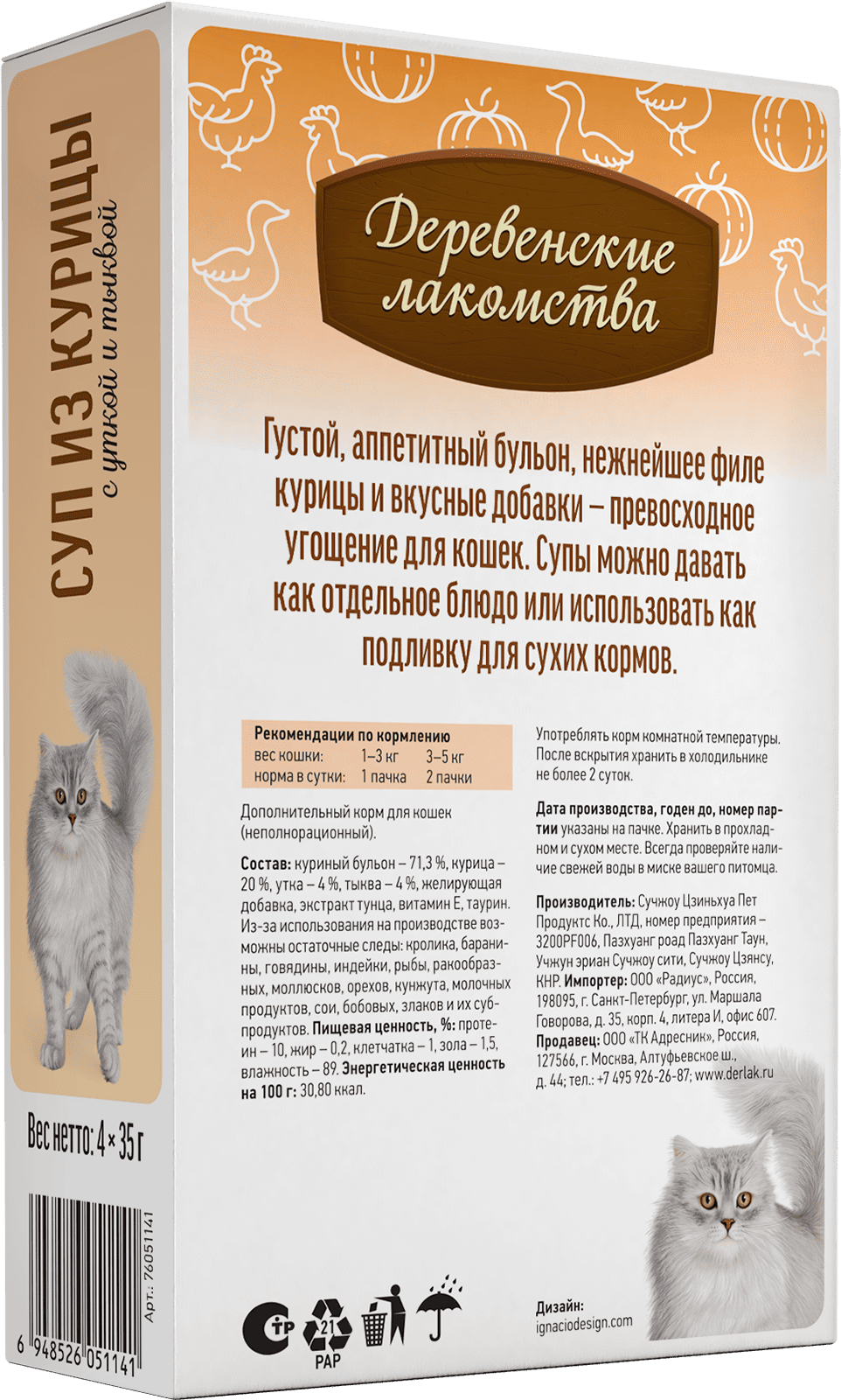 Состав: куриный бульон — 71,3%, курица — 20%, утка — 4%, тыква — 4%, желирующая добавка, экстракт тунца, витамин Е, таурин.