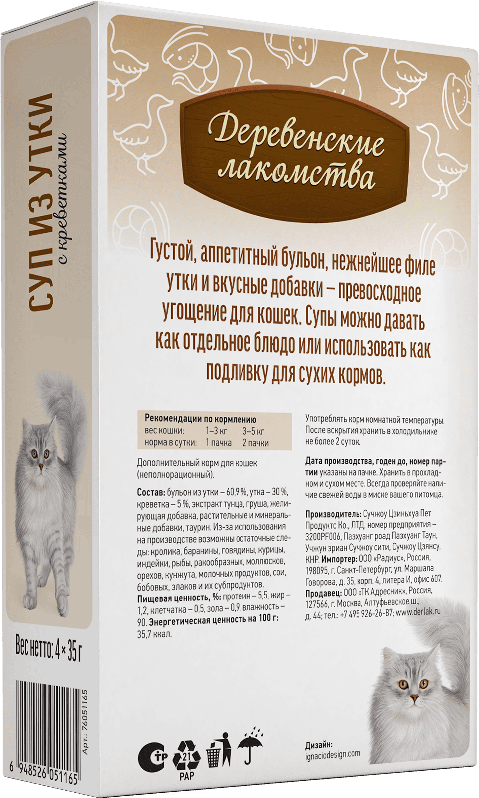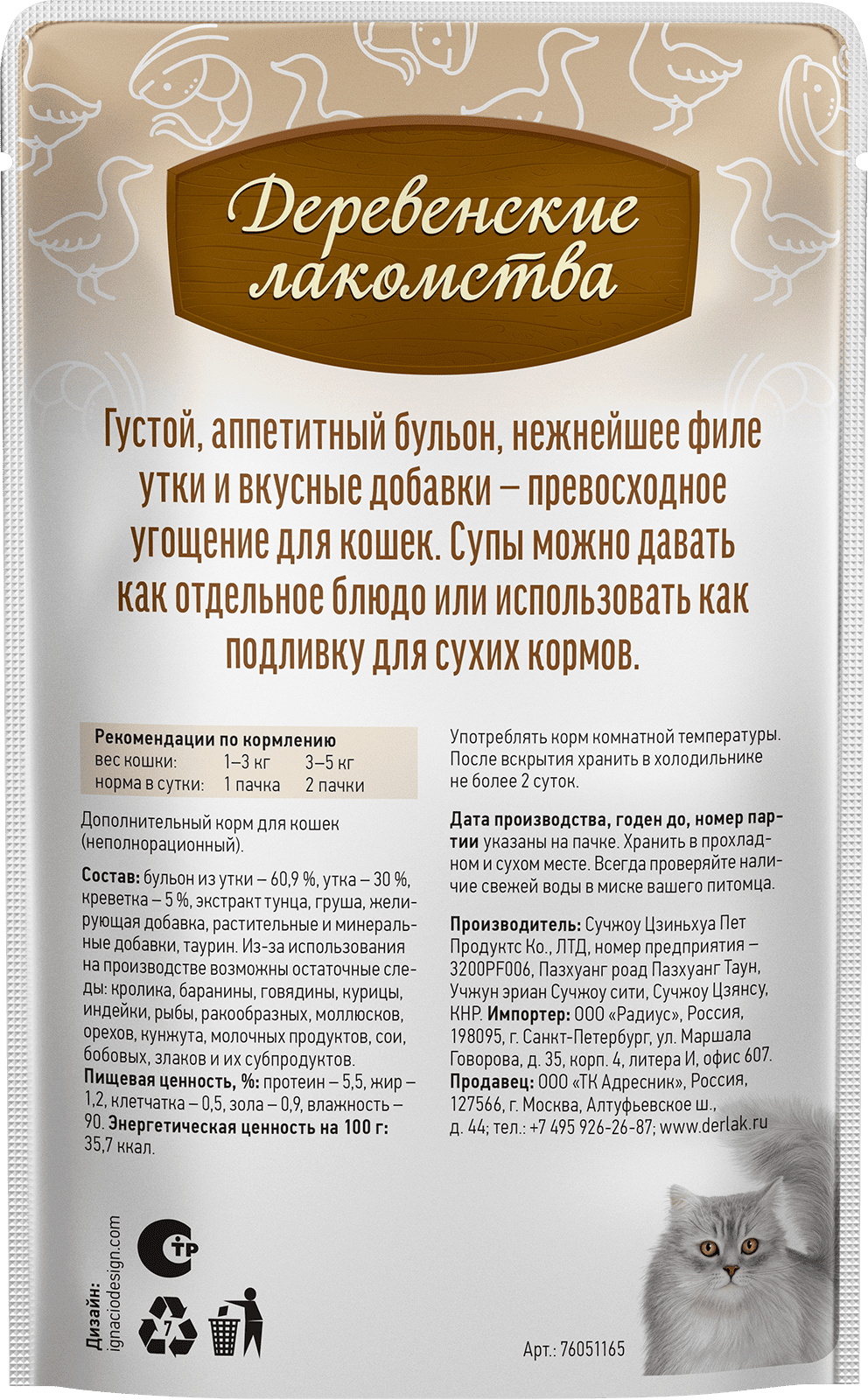 Состав: бульон из утки 60,9%, утка 30%, креветка 5%, экстракт тунца, груша, желирующая добавка, растительные и минеральные добавки, таурин.