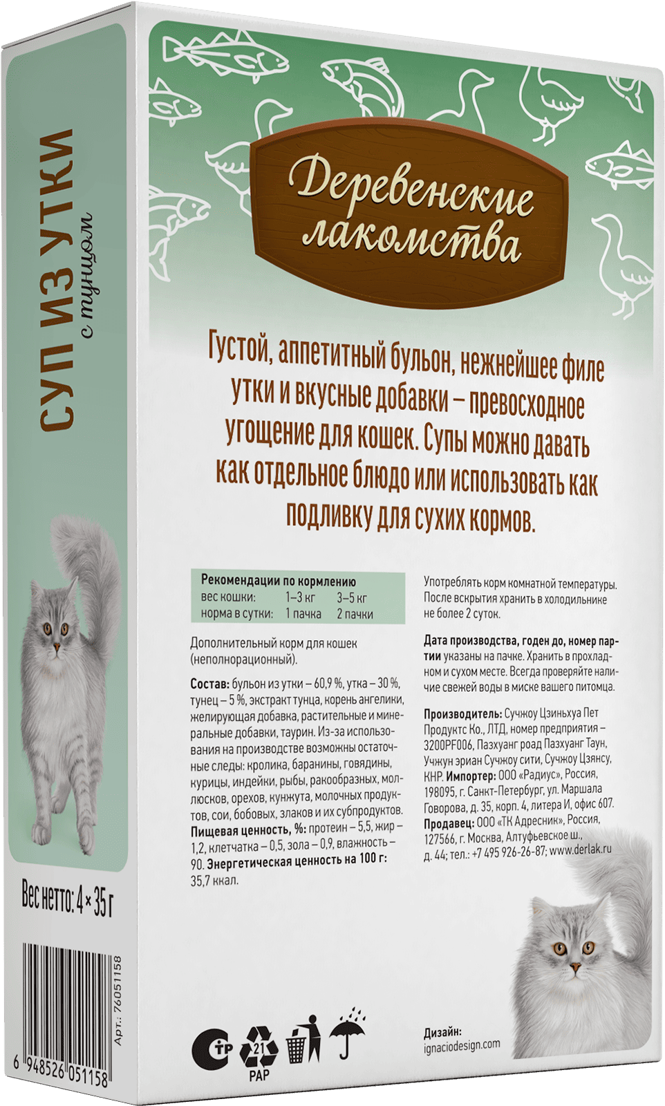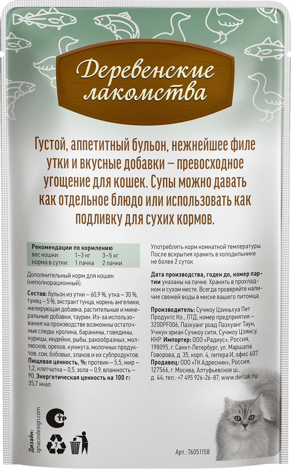 Состав: бульон из утки 60,9%, утка 30%, тунец 5%, экстракт тунца, корень ангелики, желирующая добавка, растительные и минеральные добавки, таурин.