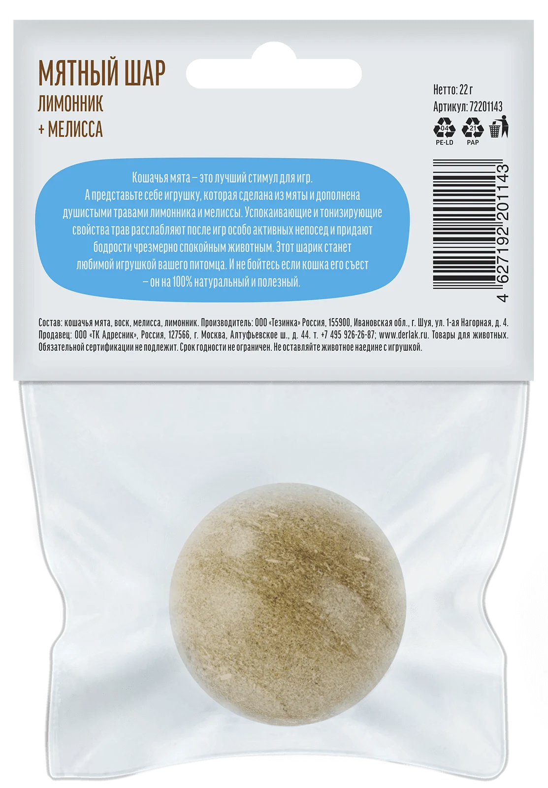 Кошачья мята — это лучший стимул для игр. А представьте себе игрушку, которая сделана из мяты и дополнена душистыми травами мелиссы и лимонника. Успокаивающие и тонизирующие свойства трав расслабляют после игр особо активных непосед и придают бодрости чрезмерно спокойным животным. Этот шарик станет любимой игрушкой вашего питомца. И не бойтесь если кошка его съест — он на 100 % натуральный и полезный.