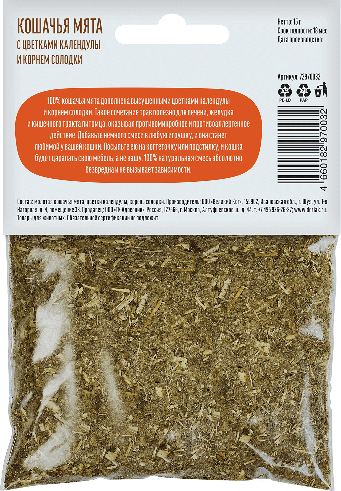 Кошачья мята — это лучший стимул для игр. А представьте себе игрушку, которая сделана из мяты, цветков календулы и корня солодки. Такое сочетание полезно для печени, желудка и кишечного тракта, оказывая противогрибковое и противоаллергенное действие. Помимо этого, смесь мяты, календулы и корня солодки имеет противовоспалительное и спазмолитическое свойства, а также полезно для дыхательной системы. Рекомендовано для более взрослых питомцев, для поддержания их здоровья и комфортного самочувствия. Корень солодки способствует комфортному пищеварению, очищает кровь, уменьшает воспаление; календула имеет противовоспалительные свойства, помогает при стоматите и ангине у кошек, при заболеваниях печени и желудка.