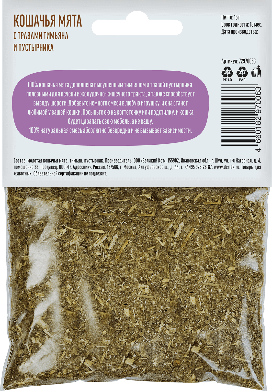 Кошачья мята — это лучший стимул для игр. А представьте себе игрушку, которая сделана из мяты и дополнена высушенным тимьяном и травой пустырника. Эти травы полезны для печени и желудочно-кишечного тракта, имеют антисептические и успокаивающие свойства, а также отхаркивающее действие, облегчая представителям семейства кошачьих их природное избавления от скопления «мусора» в организме.