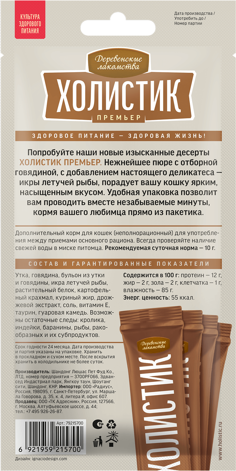 Попробуйте наши новые изысканные десерты «Холистик Премьер». Нежнейшее пюре c отборной говядиной, с добавлением настоящего деликатеса — икры летучей рыбы, порадует вашу кошку ярким, насыщенным вкусом. Удобная упаковка позволит вам проводить вместе незабываемые минуты, угощая вашего любимца прямо из пакетика.