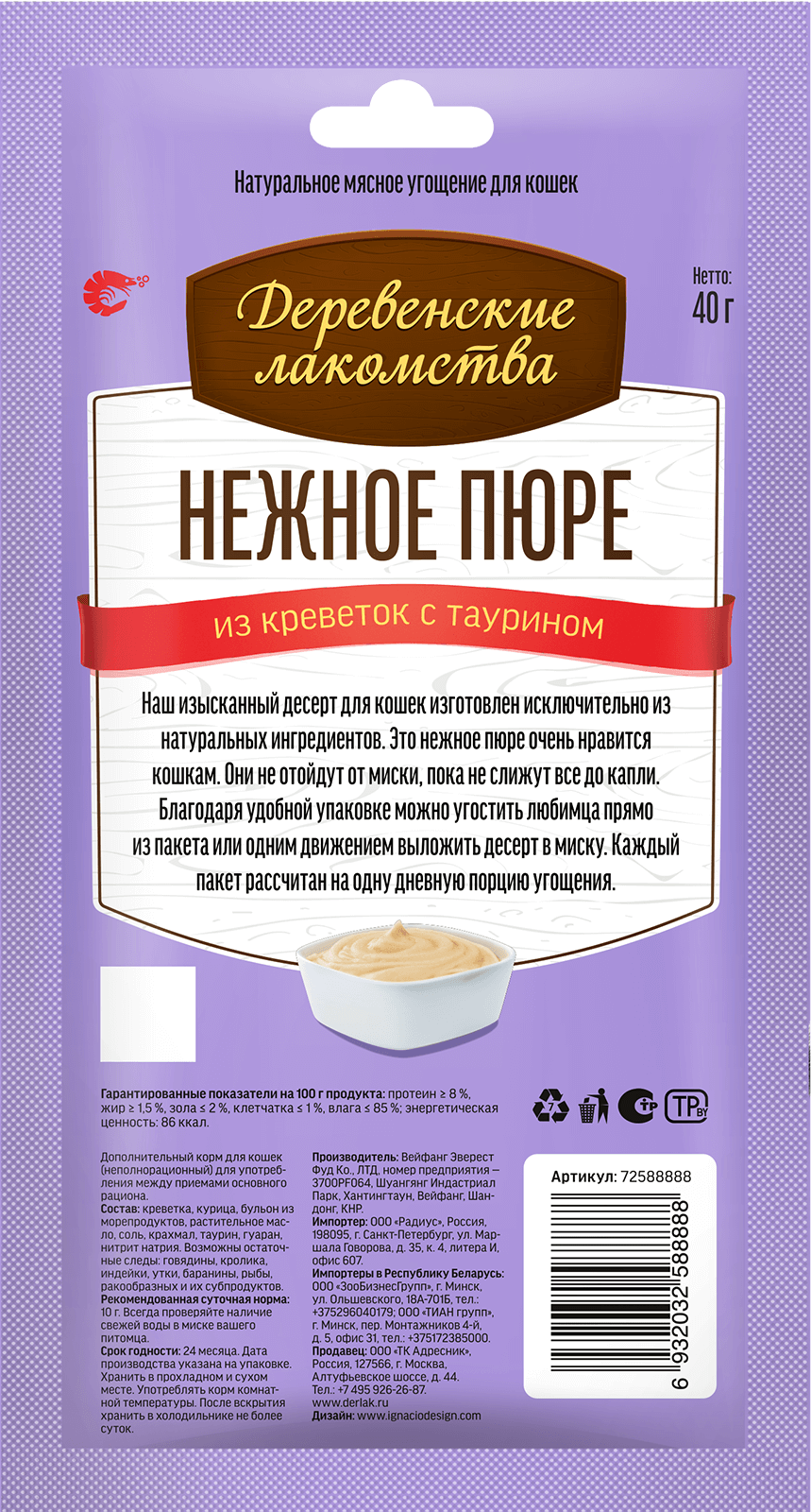 Нежнейшее пюре из креветок — изысканное угощение для самых любимых. Лакомство обогащено таурином, который не только усиливает природный вкус, но и способствует поддержанию здоровья сердца и иммунной системы.