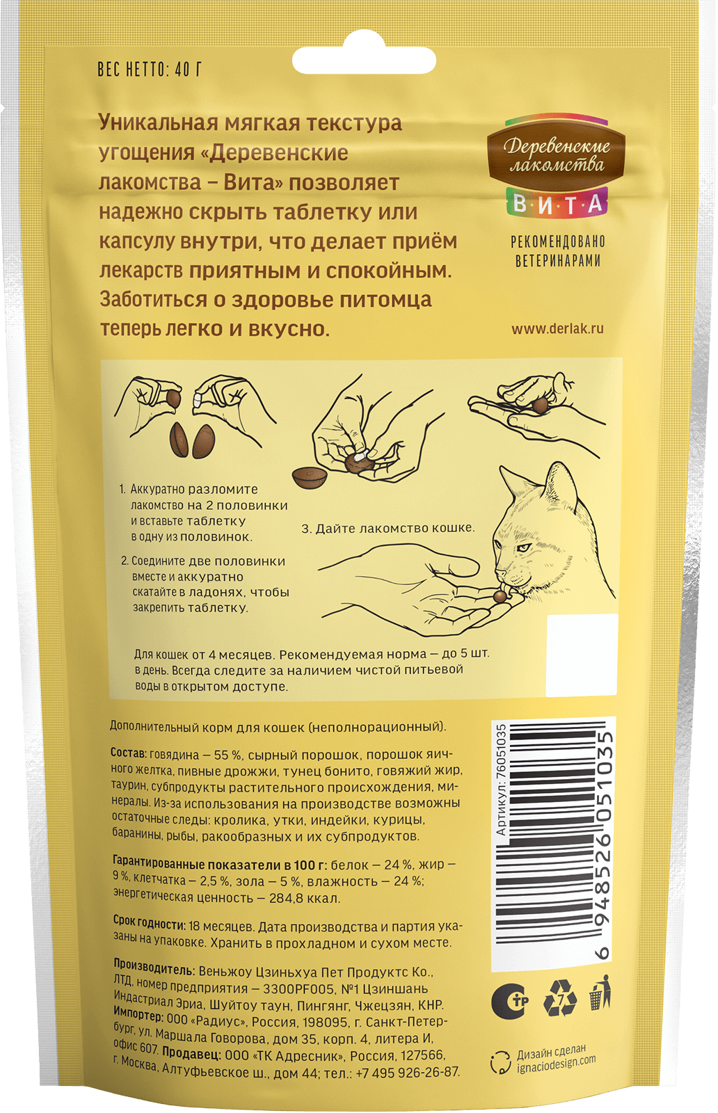 Функциональное угощение для кошек из отборной говядины для удобного приема таблеток. Уникальная мягкая текстура угощения «Деревенские лакомства — Вита» позволяет надежно скрыть таблетку или капсулу внутри. Его восхитительный вкус и аромат отвлекут вашего питомца, а удобная текстура позволит легко спрятать лекарство. Теперь забота о здоровье станет проще и приятнее!
