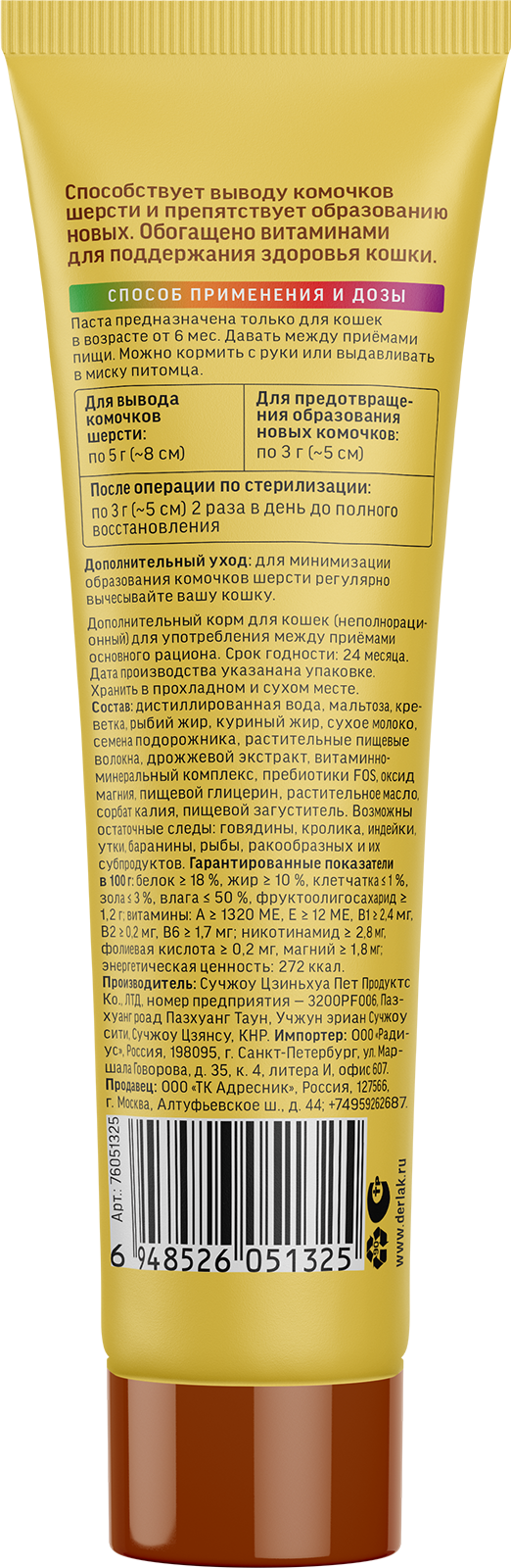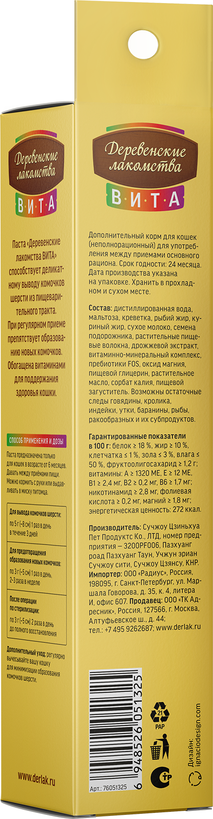 Функциональная паста «Вита. Вывод шерсти» со вкусом креветки является незаменимым помощником в заботе о благополучии вашей кошки. Её уникальная формула помогает деликатно выводить комочки шерсти, накапливающиеся в пищеварительном тракте и при регулярном приеме способствует эффективному предотвращению появления новых комочков. Каждая порция пасты обогащена витаминами и минералами. Вкус креветки добавляет пасте привлекательности, что делает ее прием не только полезным, но и приятным времяпрепровождением для вашего питомца.