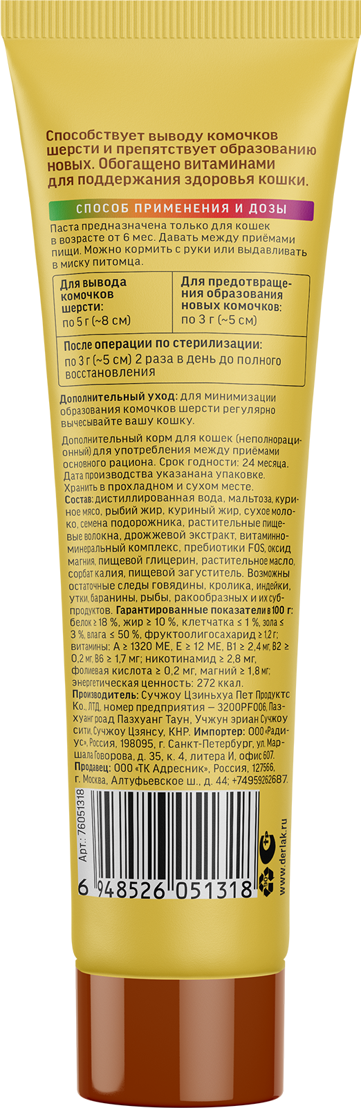 Состав: дистилированная вода, мальтоза, куриное мясо, рыбий жир, куриный жир, сухое молоко, семена подорожника, растительные пищевые волокна, дрожжевой экстракт, витаминно-минеральный комплекс, пребиотики FOS, оксид магния, пищевой глицерин, растительное масло, сорбат калия, пищевой загуститель.
