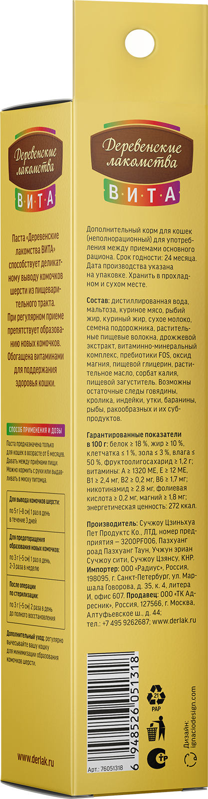 Функциональная паста «Вита. Вывод шерсти» со вкусом курицы является незаменимым помощником в заботе о благополучии вашей кошки. Её уникальная формула помогает деликатно выводить комочки шерсти, накапливающиеся в пищеварительном тракте и при регулярном приеме способствует эффективному предотвращению появления новых комочков. Каждая порция пасты обогащена витаминами и минералами. Вкус курицы добавляет пасте привлекательности, что делает ее прием не только полезным, но и приятным времяпрепровождением для вашего питомца.