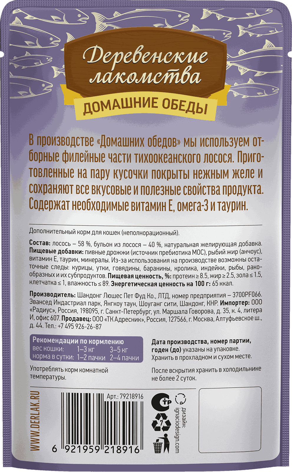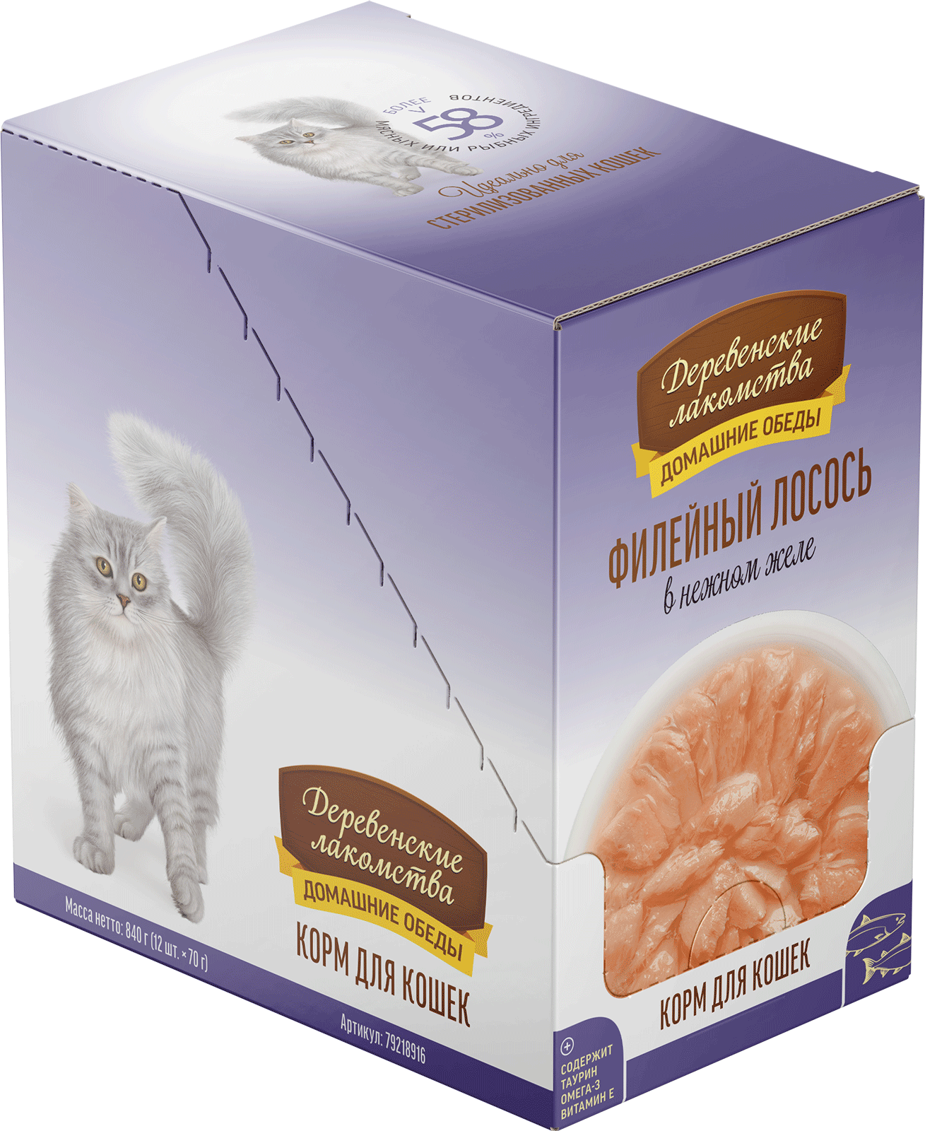 Состав: лосось 58 %, бульон из лосося 40 %, натуральная желирующая добавка.