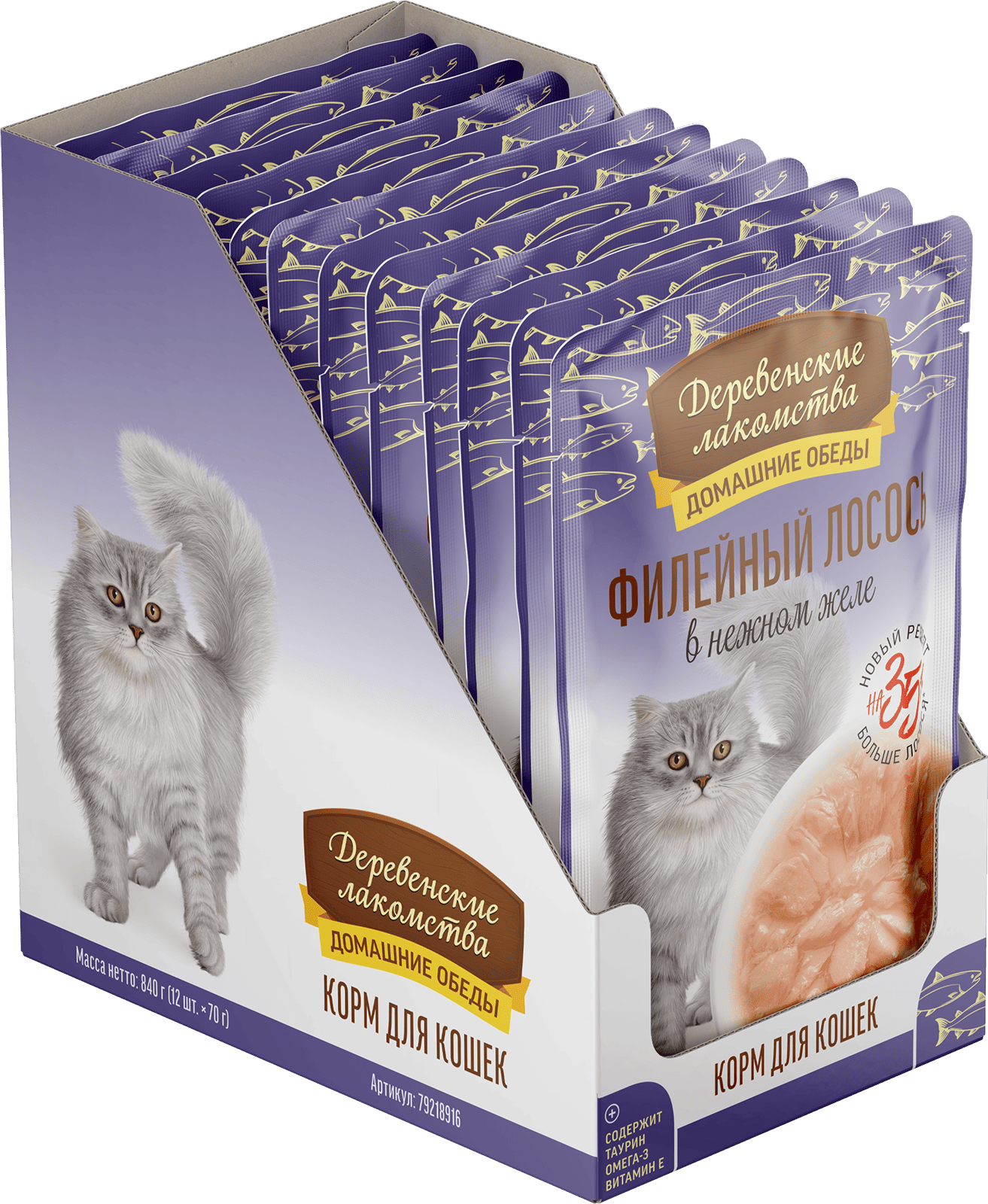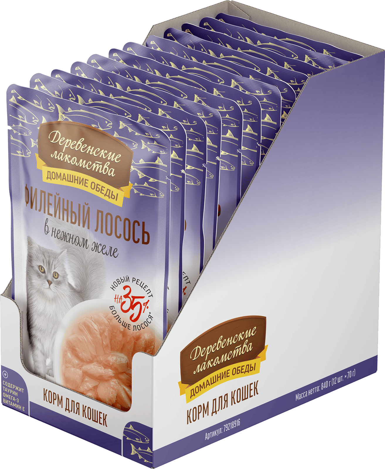 Консервированный влажный корм для кошек серии «Деревенские лакомства — Домашние обеды» из филейного лосося в нежном желе для кошек — настоящее кулинарное волшебство для пушистых любимцев. Каждый бережно отобранный кусочек сочного лосося насыщен омега-3 жирными кислотами, способствующими здоровью кожи и шерсти. Легкая текстура желе облегчает процесс потребления, делая этот продукт идеальным даже для самых привередливых питомцев. Ваши забота и внимание обязательно будут оценены!