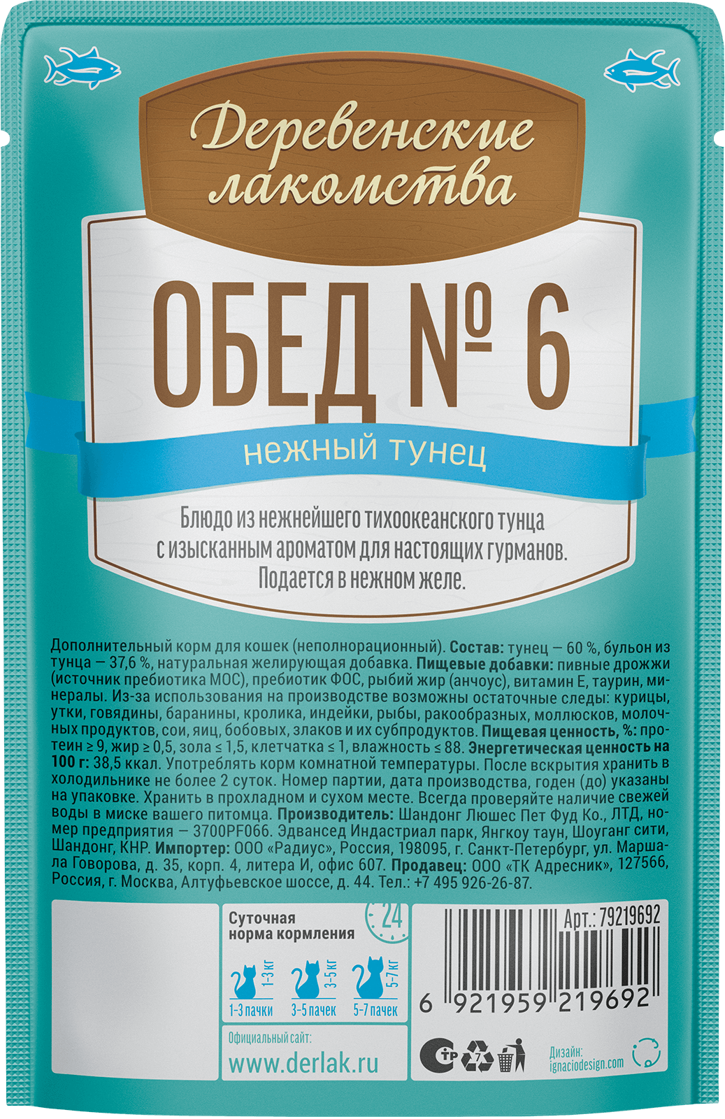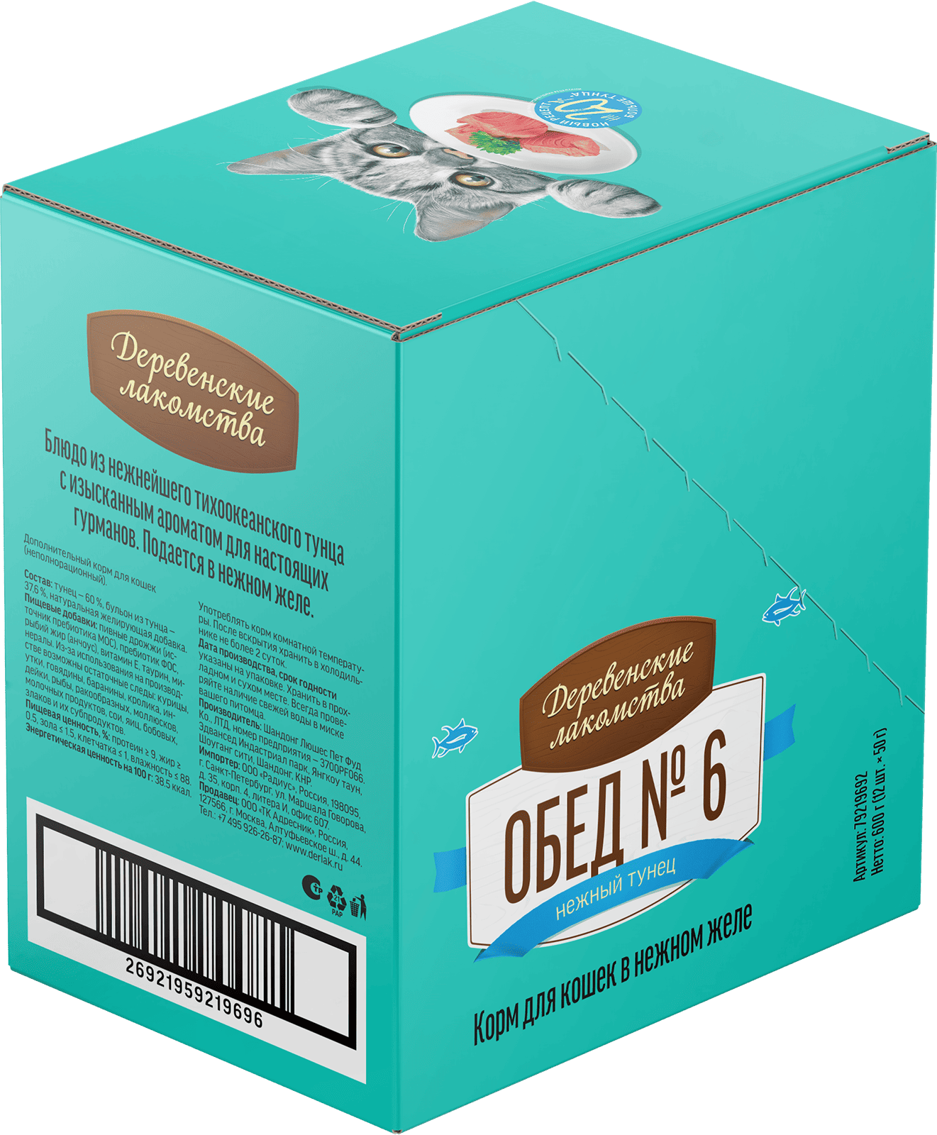 Консервированный влажный корм для кошек серии «Деревенские лакомства — Рыбные обеды» из нежнейшего тихоокеанского тунца — изысканное блюдо для настоящих пушистых гурманов. Тёмное мясо тунца отличается нежной текстурой и более ярким ароматом, такое мясо насыщает корм вкусом морской рыбы. Подаётся в нежном желе, которое не только улучшает текстуру корма, но и способствует лучшему усвоению питательных веществ.