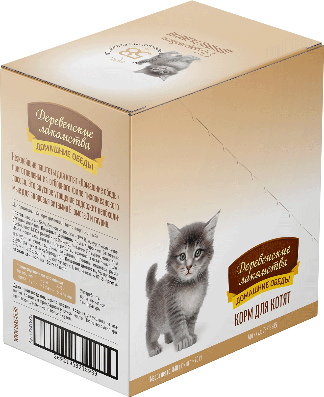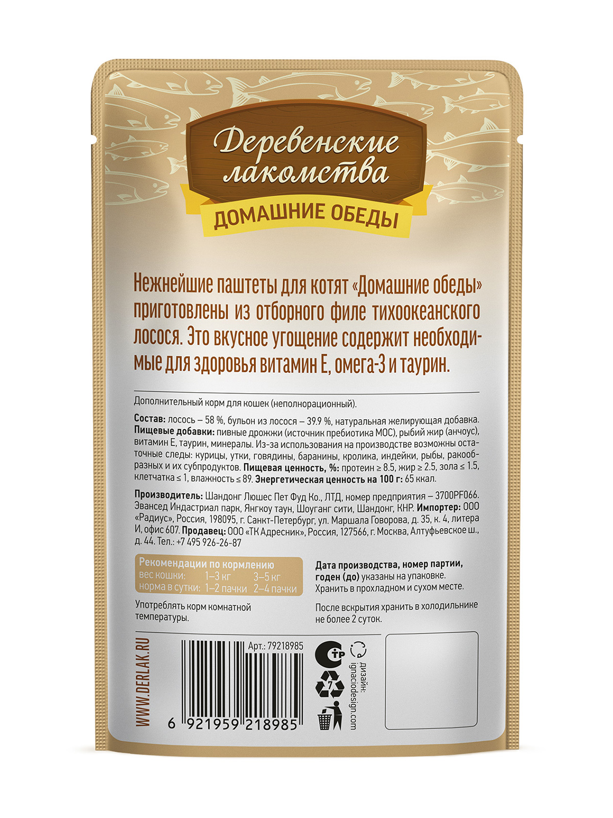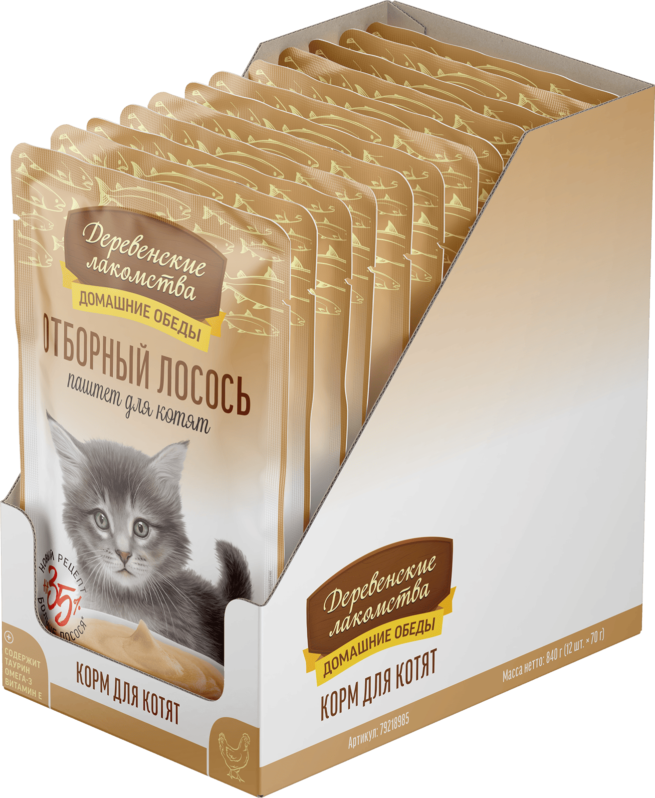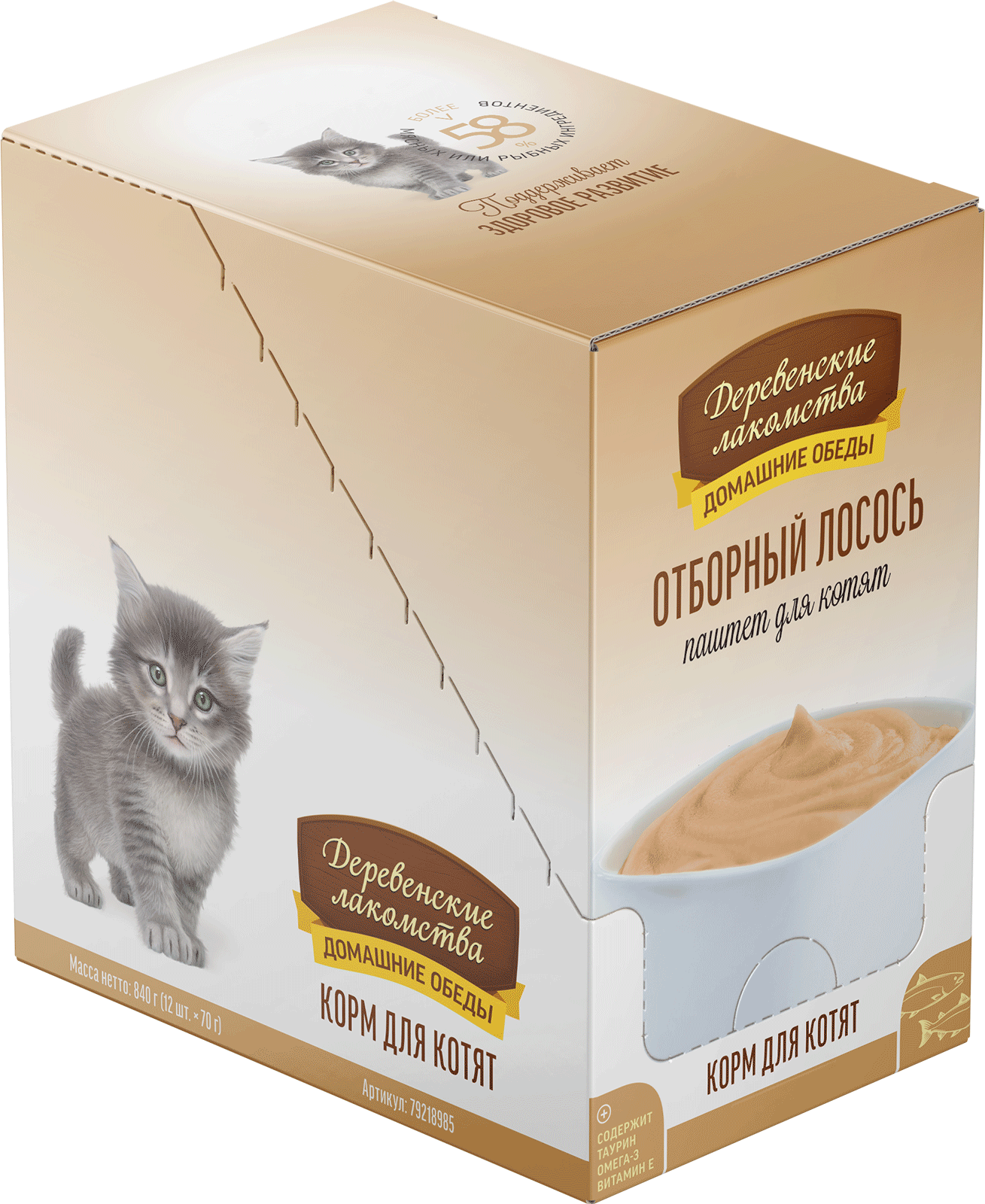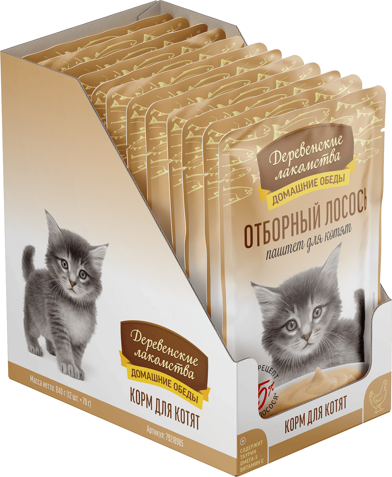 Консервированный влажный корм для котят серии «Деревенские лакомства — Домашние обеды» из отборного лосося. Для этого деликатеса мы отобрали только свежайший лосось, богатый витаминами и омега-3 жирными кислотами, столь необходимыми для роста и развития котенка. Мягкая текстура паштета идеально подходит для нежных зубок маленьких котят. Паштет содержит витамин Е и таурин, легко усваивается и не вызывает аллергии, что делает его идеальным выбором для первой прикормки.