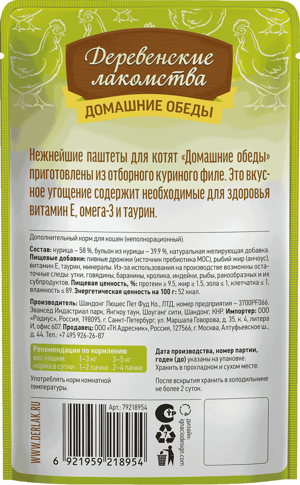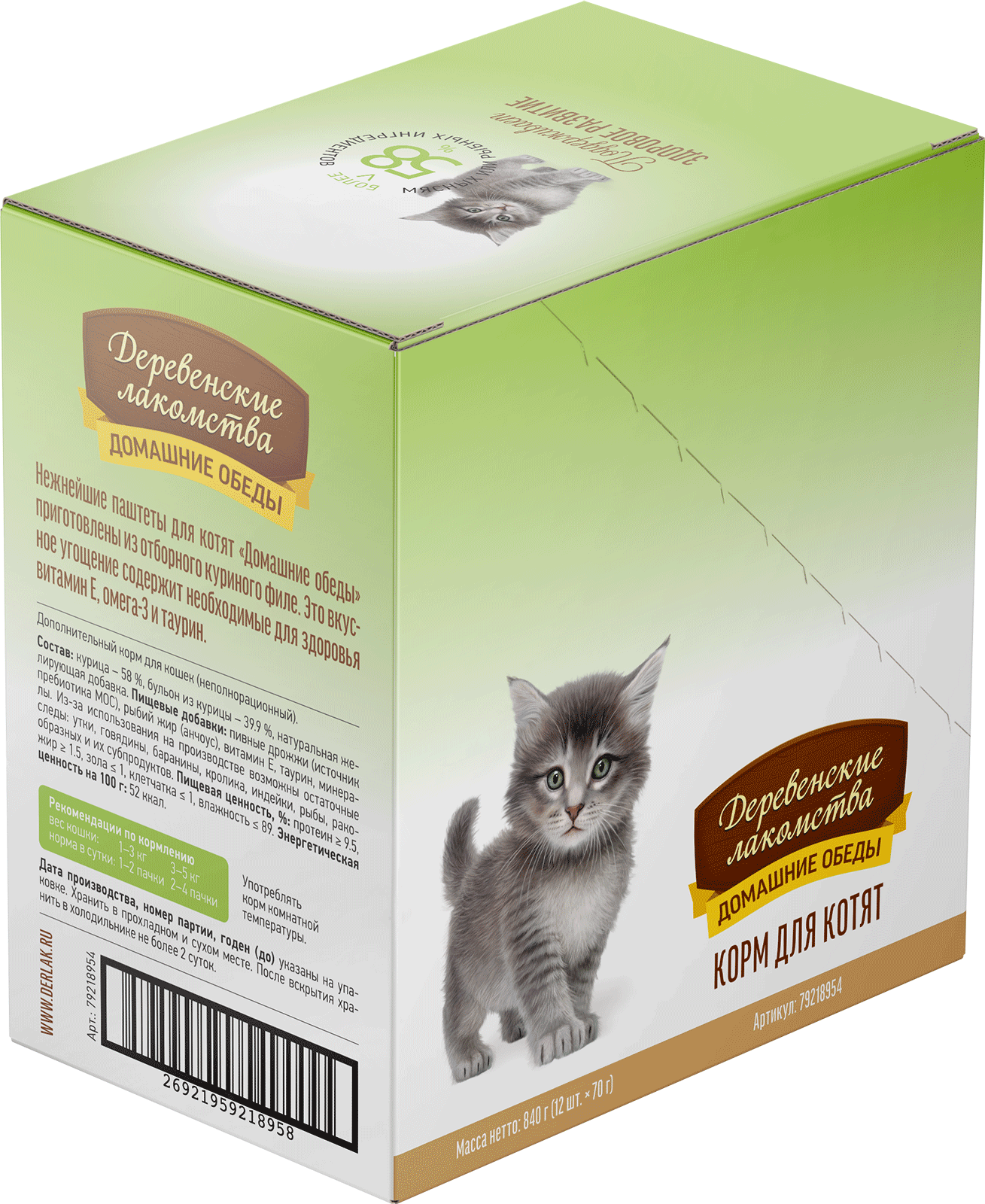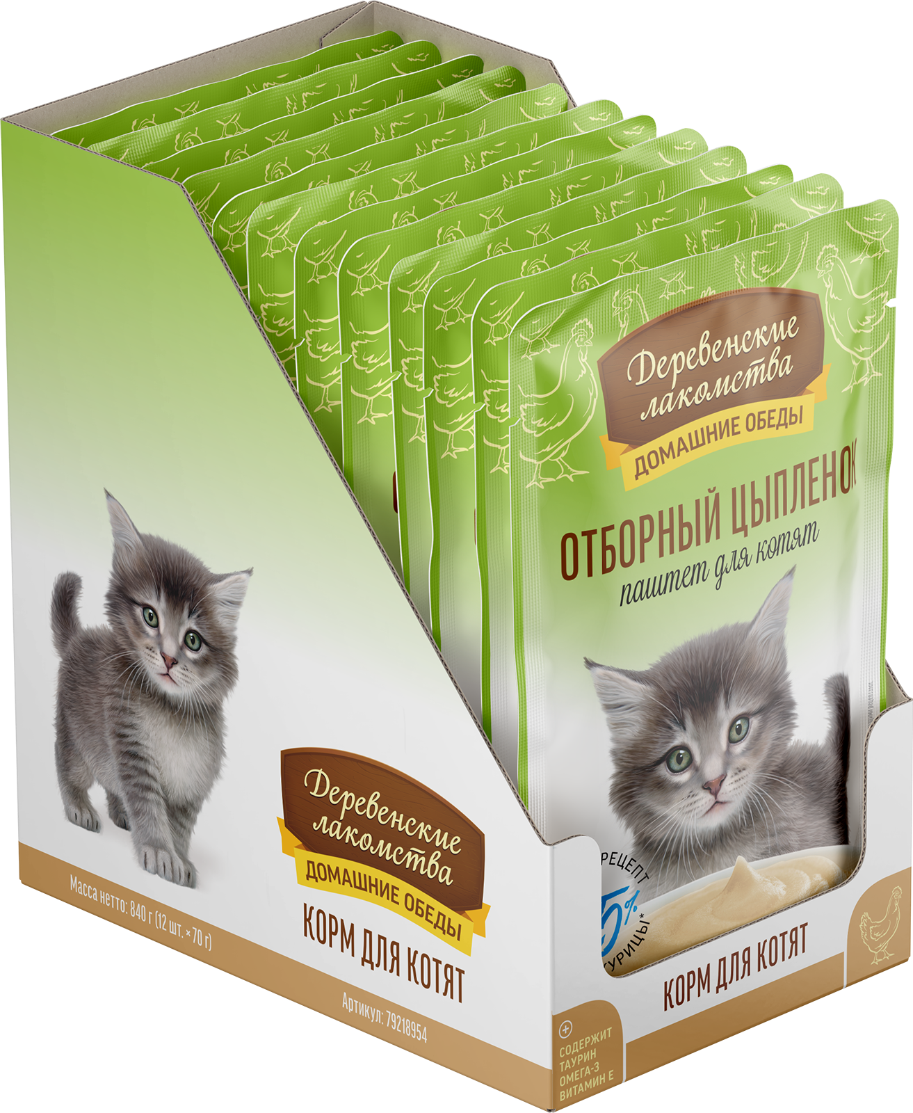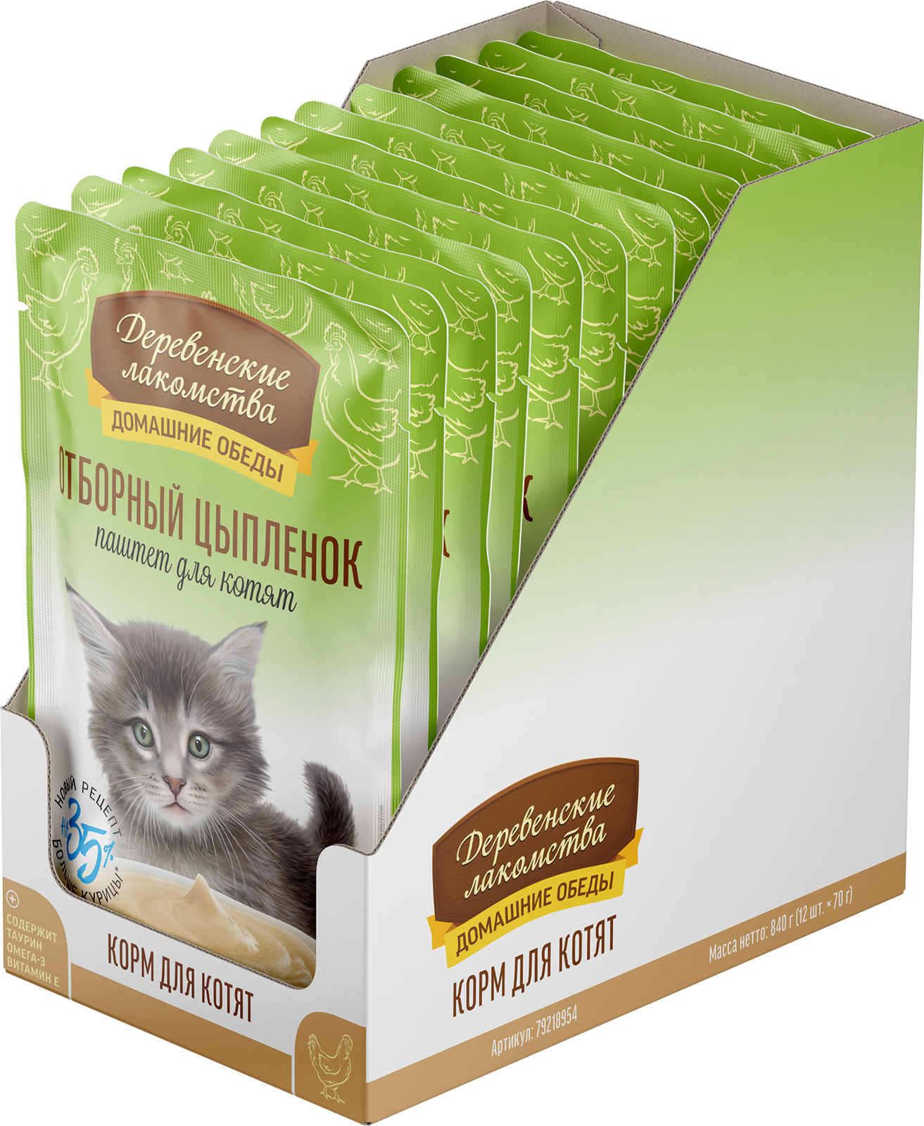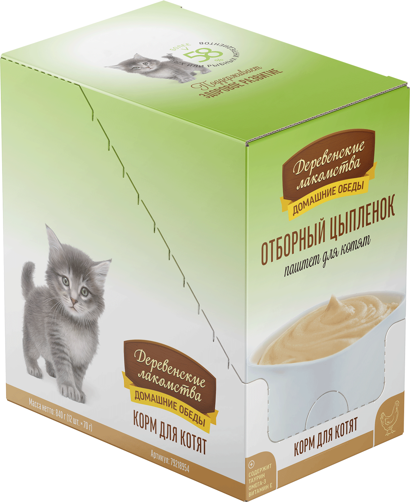 Консервированный влажный корм для котят серии «Деревенские лакомства — Домашние обеды» в виде паштета из мяса цыпленка приготовлен специально для малышей по уникальной рецептуре и имеет нежную текстуру. Это вкусное угощение содержит витамин Е, Омега-3 и таурин. Натуральный состав и полезные добавки помогут вашему котенку расти здоровым, полным сил и энергии!