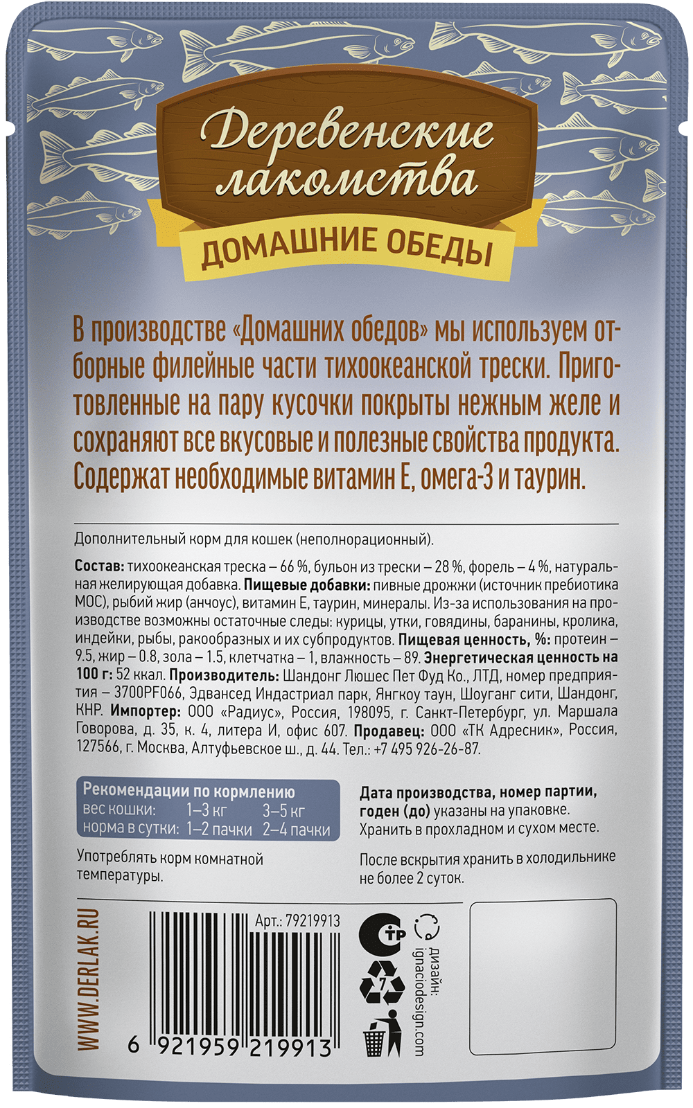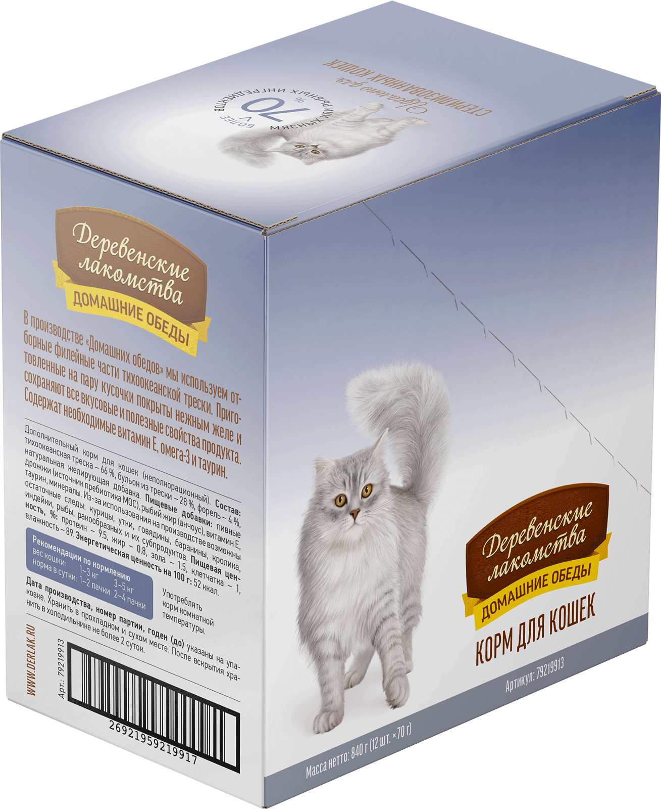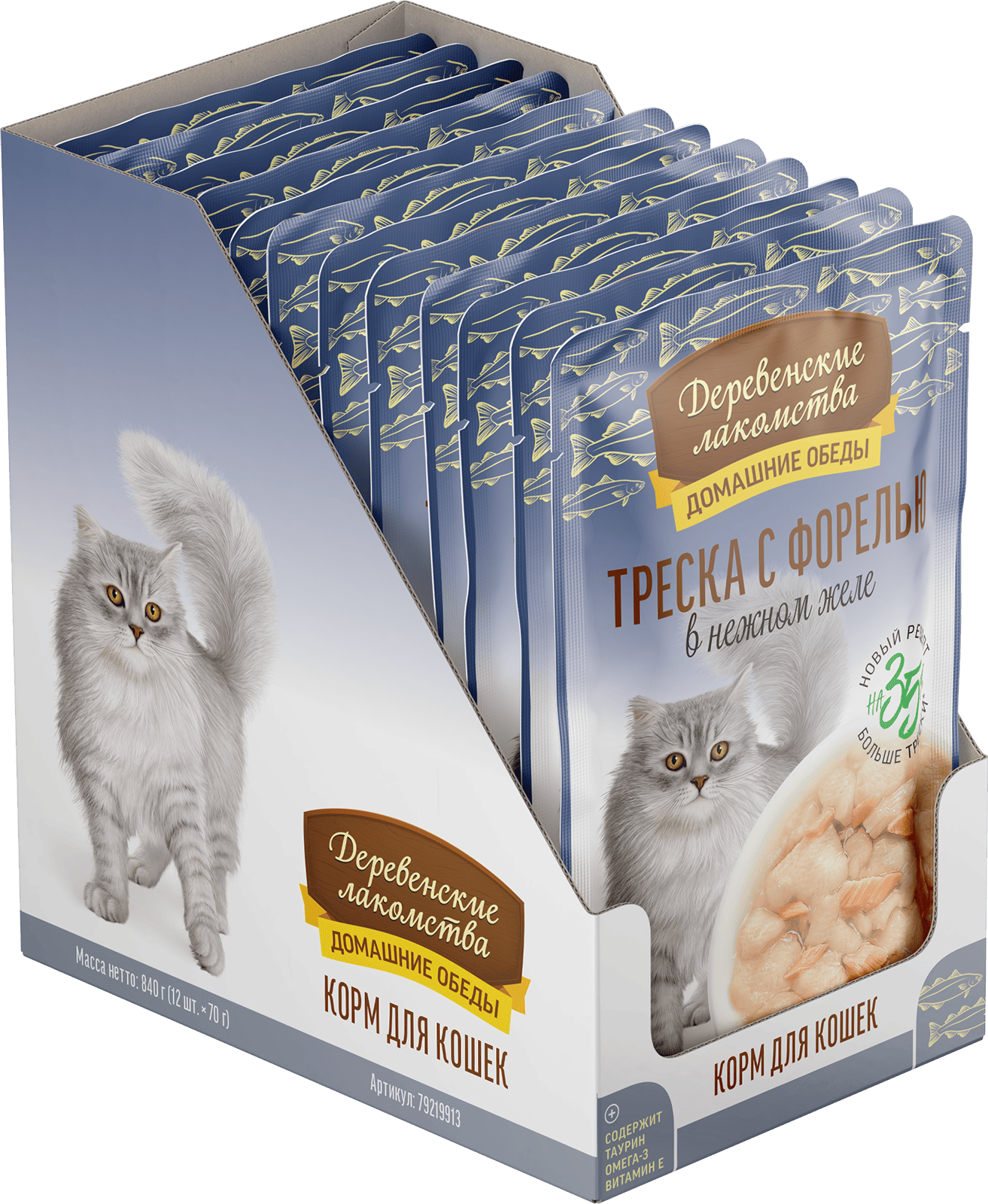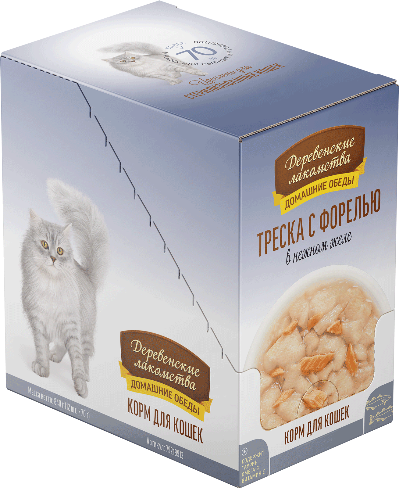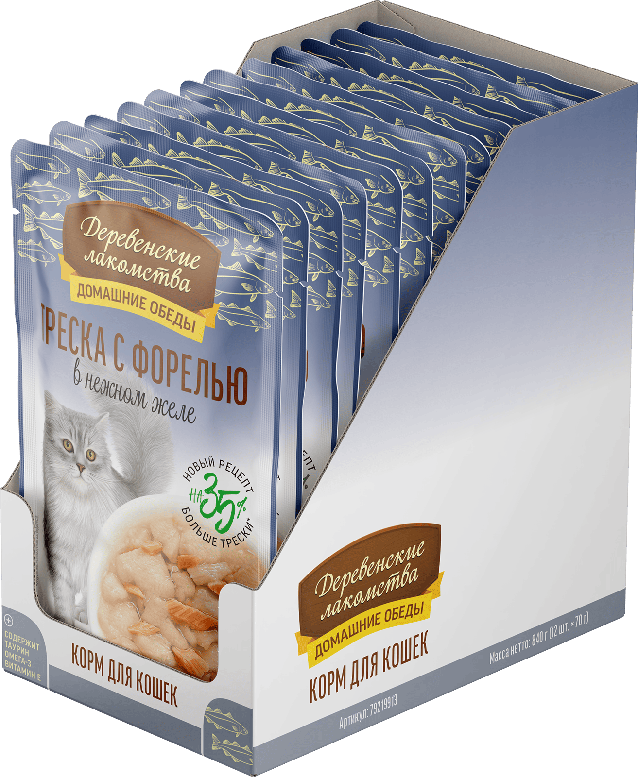 Консервированный влажный корм для кошек серии «Деревенские лакомства — Домашние обеды» — гастрономическое наслаждение, созданное с любовью и заботой. Мы мастерски объединили отборную треску и нежную форель, чтобы создать неповторимое сочетание, которое станет настоящим праздничным угощением для вашей кошки каждый день. Кусочки рыбы, приготовленные на пару, сохраняют все полезные вещества и аромат, делая корм настоящим деликатесом. Легкое, воздушное желе придает блюду неповторимую текстуру и дополнительную сочность.