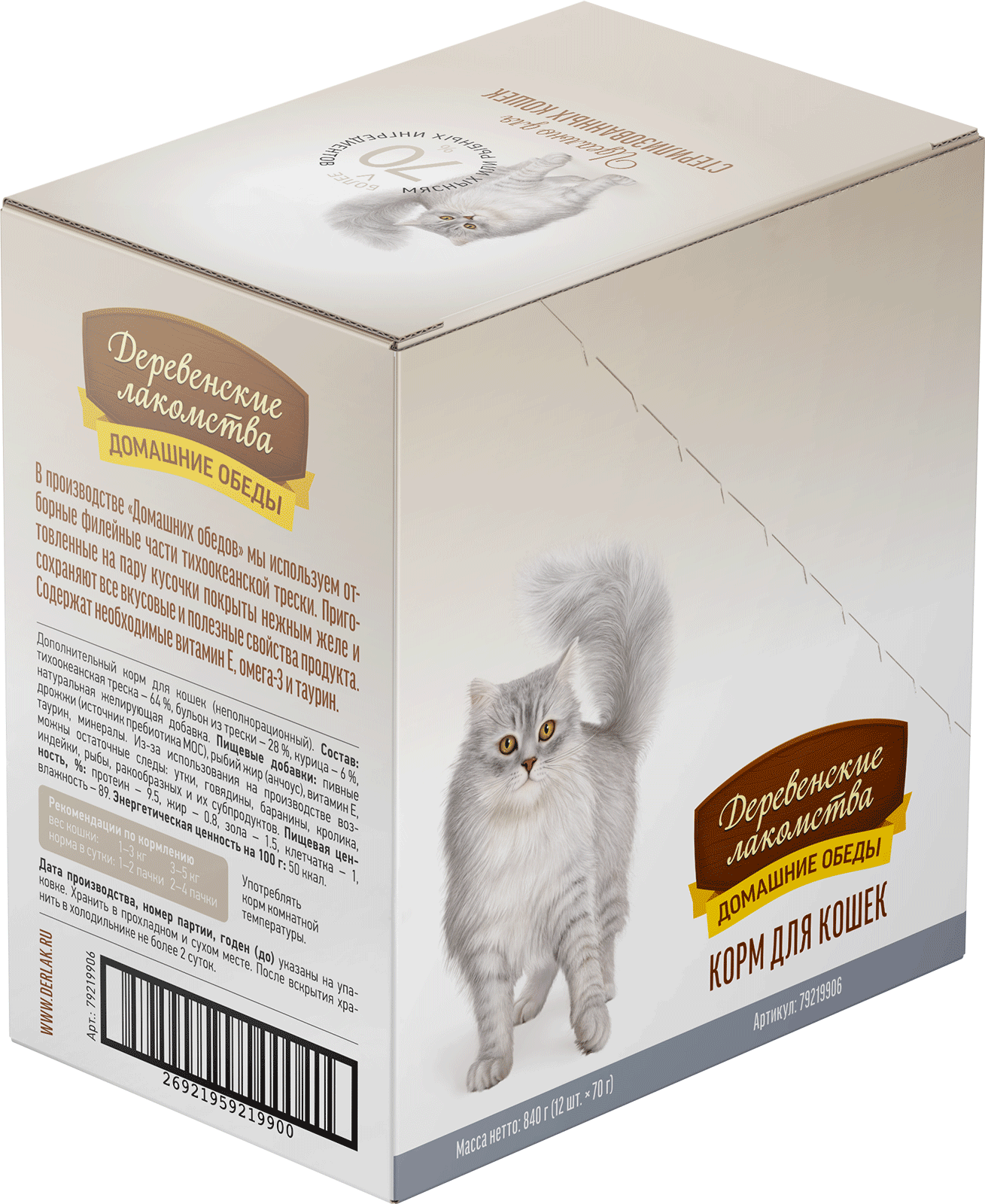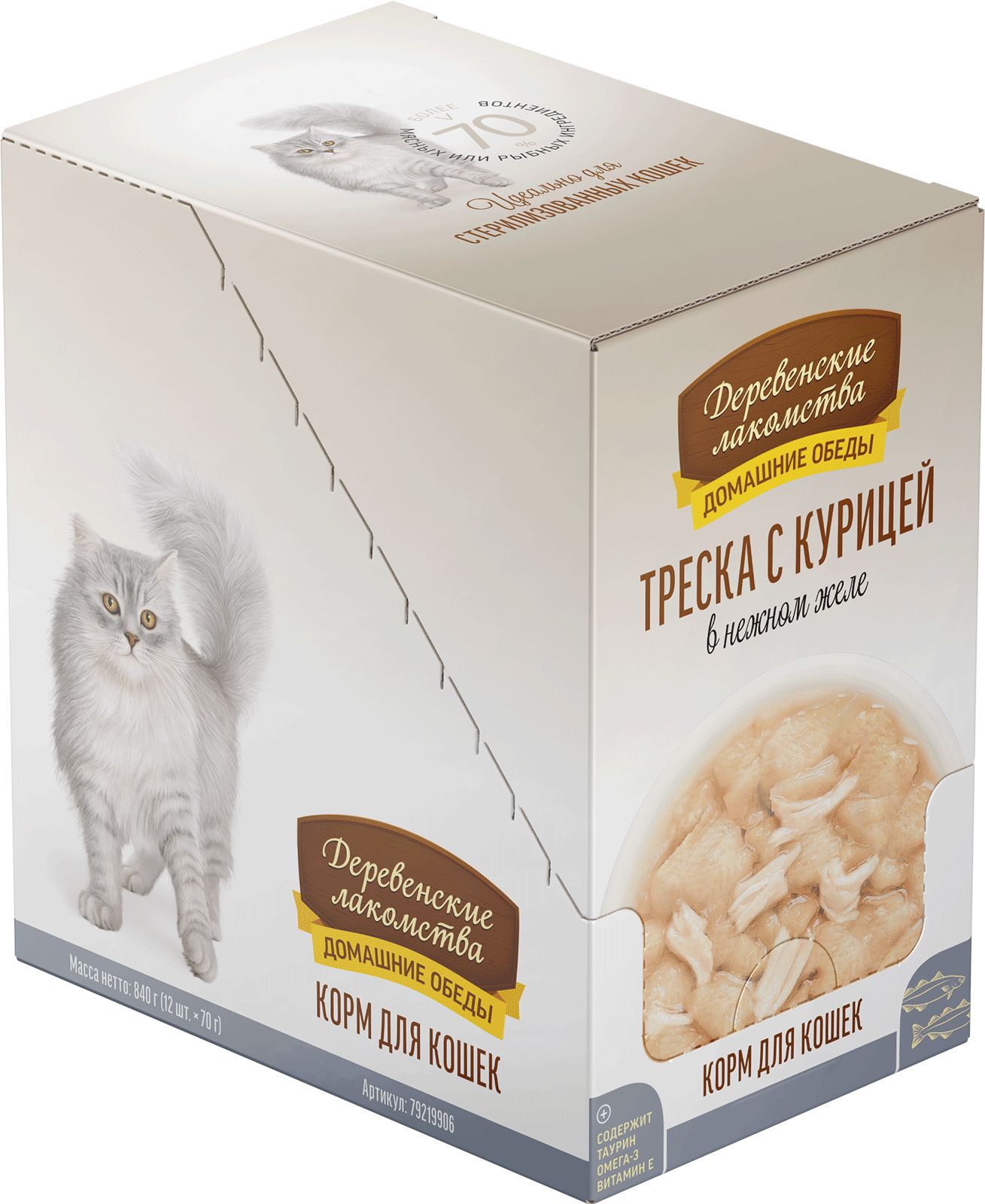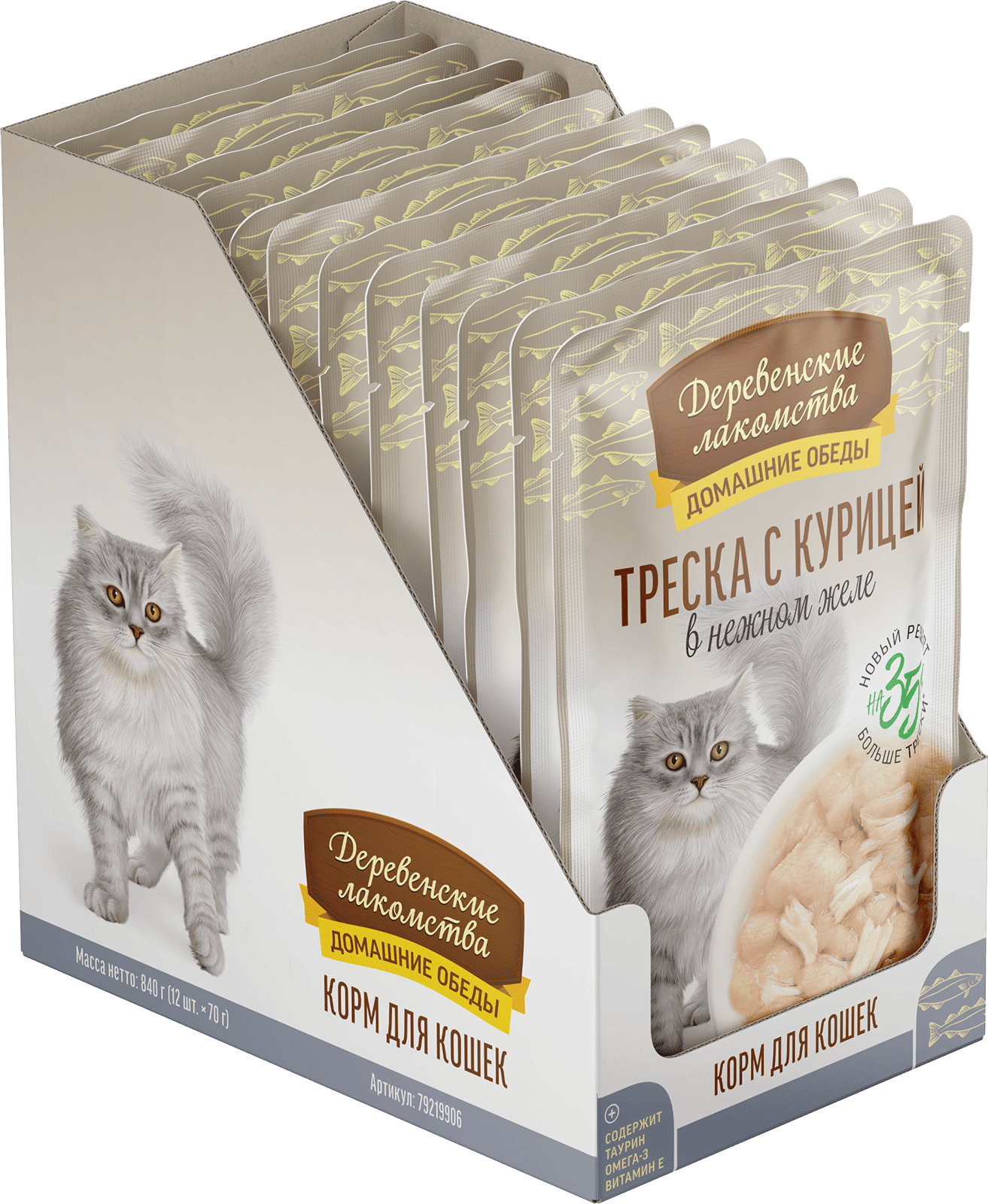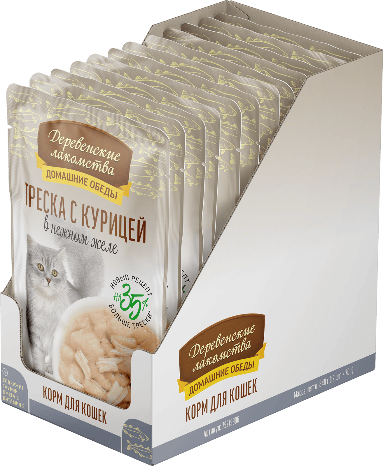 Консервированный влажный корм для кошек серии «Деревенские лакомства — Домашние обеды» — идеальное блюдо для каждого дня! Мы тщательно отобрали треску и куриное мясо, чтобы создать уникальную формулу, богатую на протеины и вкус. Кусочки рыбы и курицы, приготовленные на пару, сохраняют все полезные вещества, влагу и насыщенный вкус, превращая корм в настоящую кулинарную находку. Легкое, воздушное желе придает блюду неповторимую текстуру и дополнительную сочность.