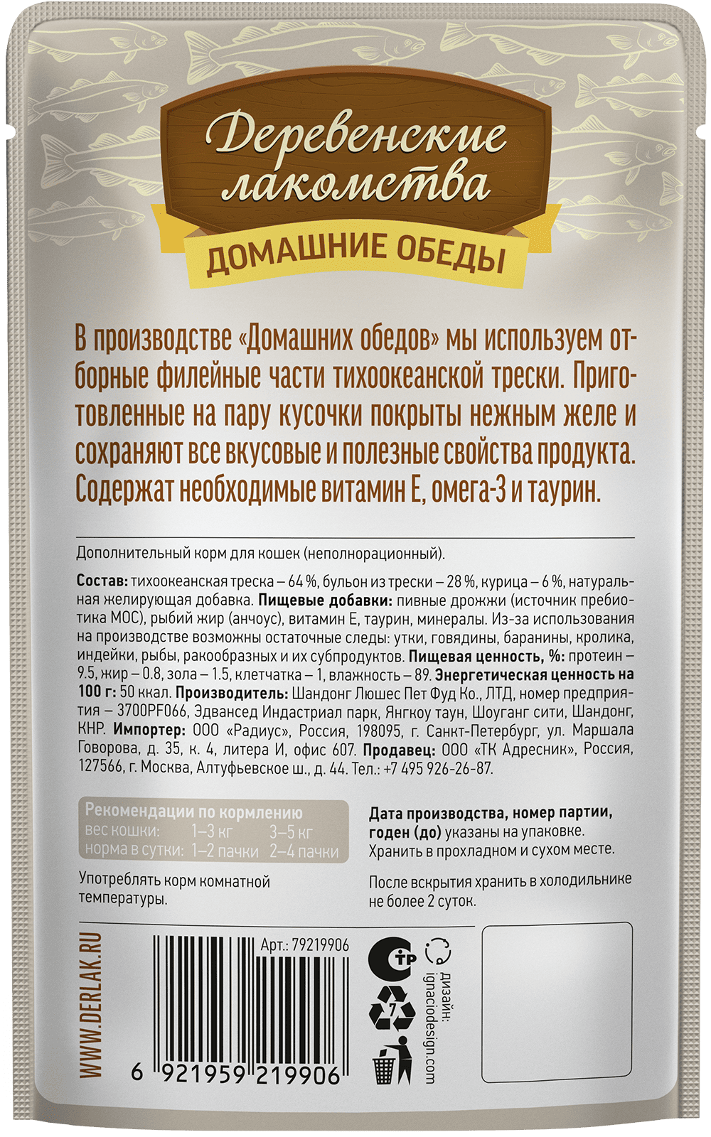 Состав: тихоокеанская треска 64%, бульон из трески 28%, курица 6%, натуральная желирующая добавка.