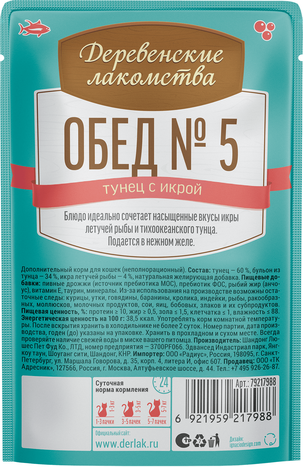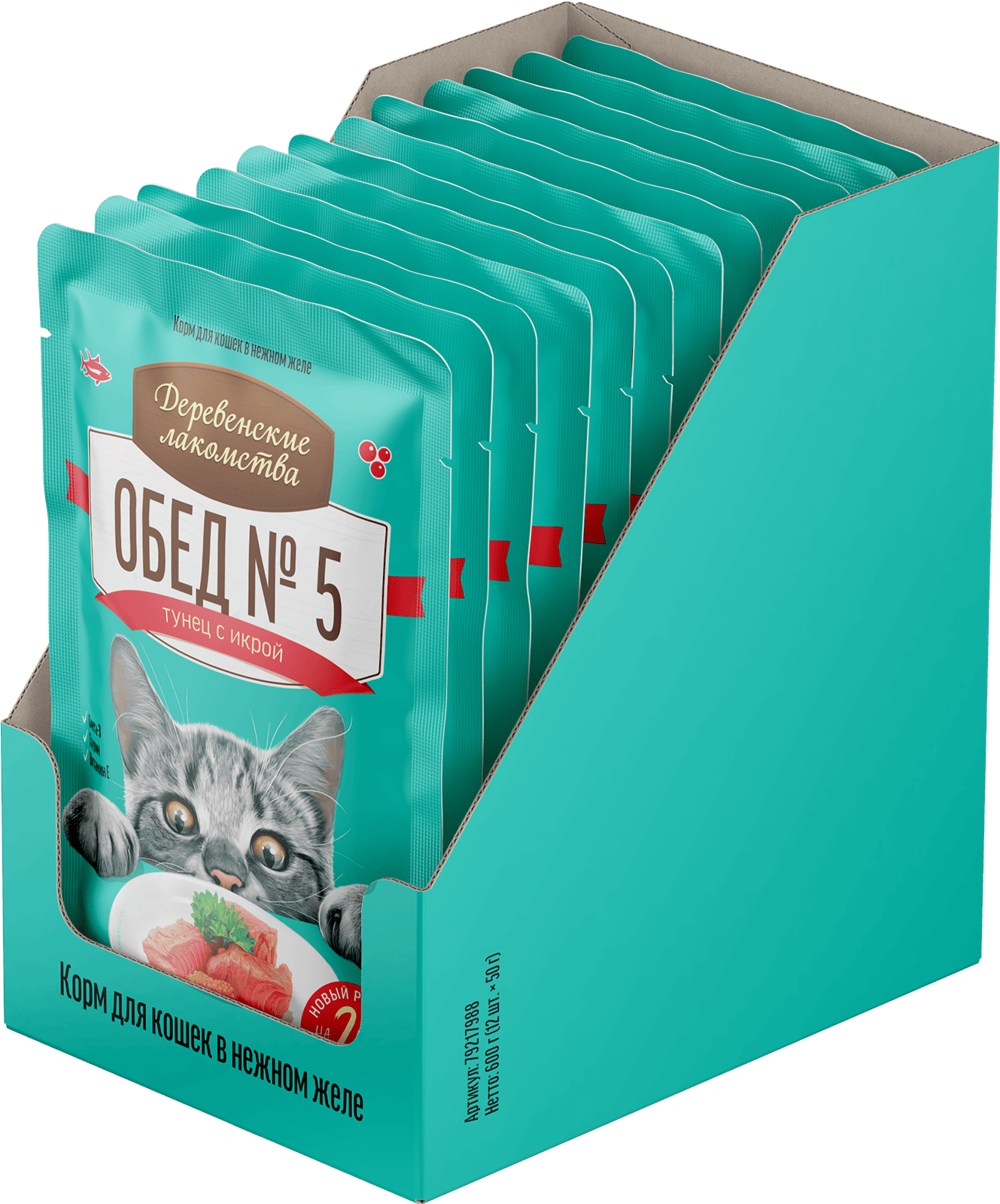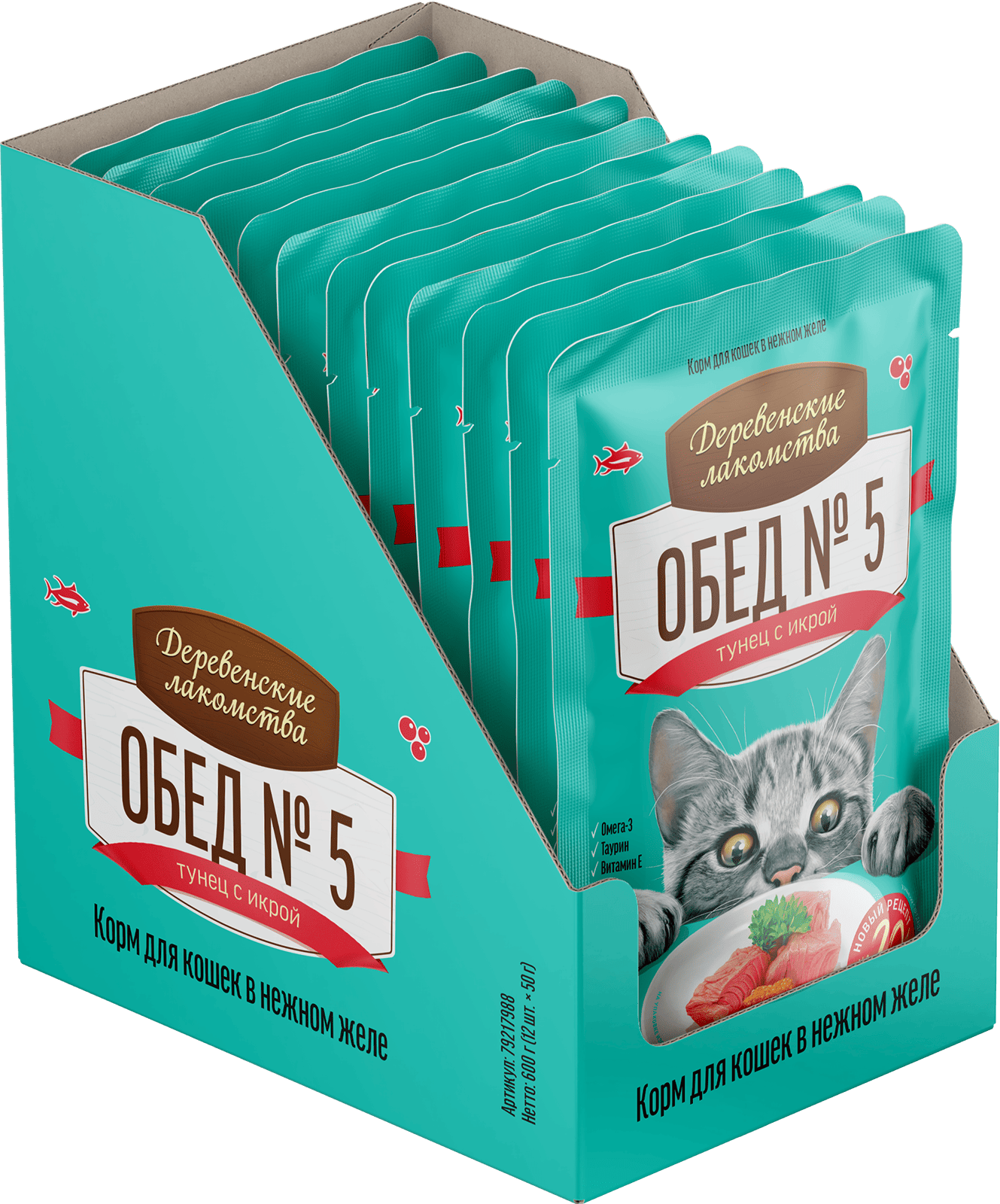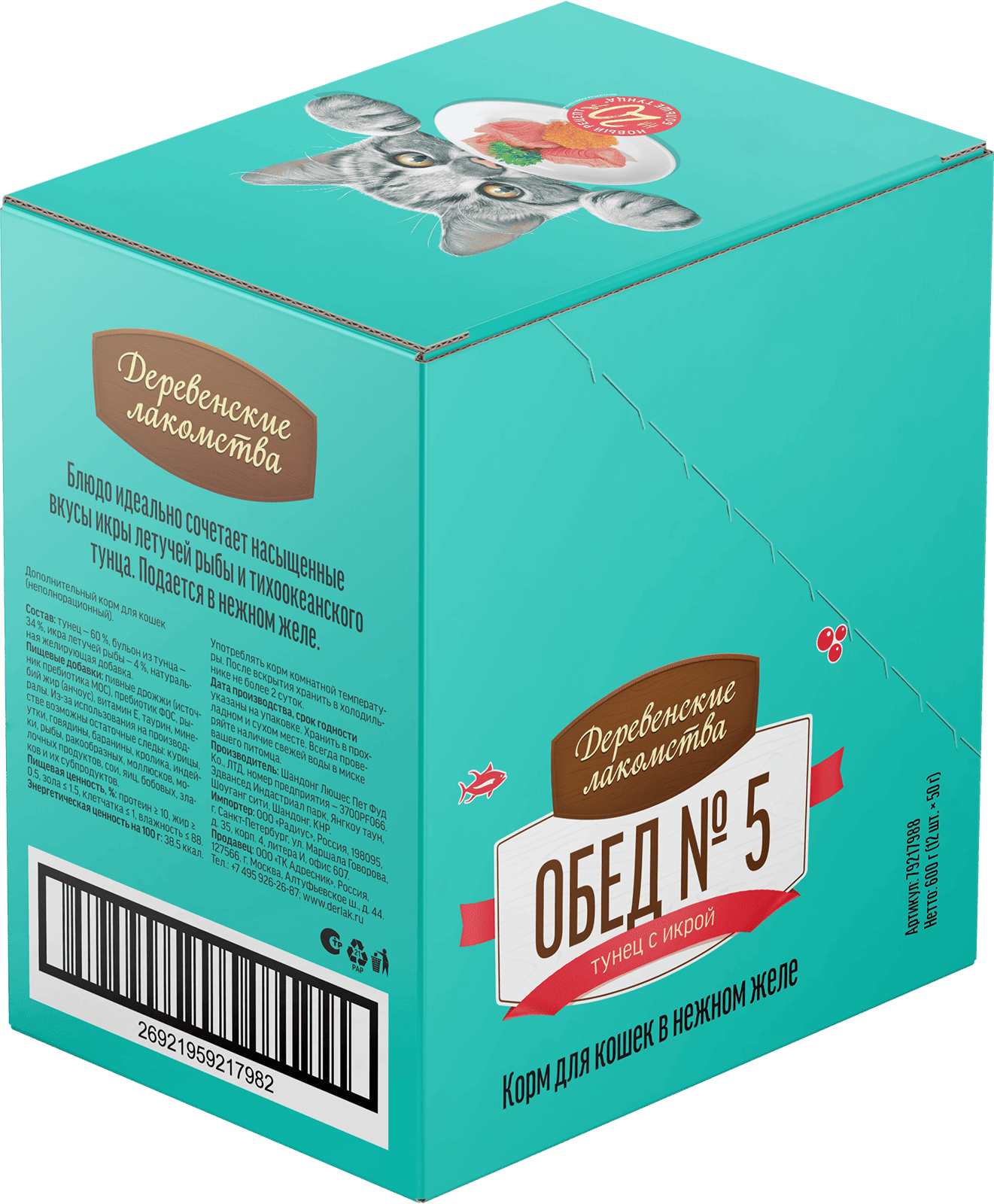 Консервированный влажный корм для кошек серии «Деревенские лакомства — Рыбные обеды» содержит большое количество мяса тихоокеанского тунца, которое идеально сочетается с насыщенным вкусом икры летучей рыбы. Подаётся в нежном желе, которое не только улучшает текстуру корма, но и способствует лучшему усвоению питательных веществ.
