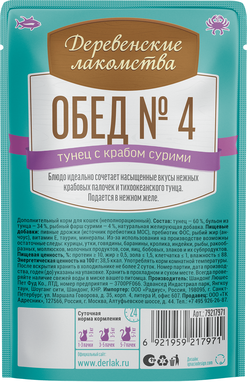 Консервированный влажный корм для кошек серии «Деревенские лакомства — Рыбные обеды» идеально сочетает вкусы тихоокеанского тунца и кусочков крабового мяса. Тёмное мясо тунца отличается нежной текстурой и более ярким ароматом, такое мясо насыщает корм вкусом морской рыбы. Подаётся в нежном желе, которое не только улучшает текстуру корма, но и способствует лучшему усвоению питательных веществ.