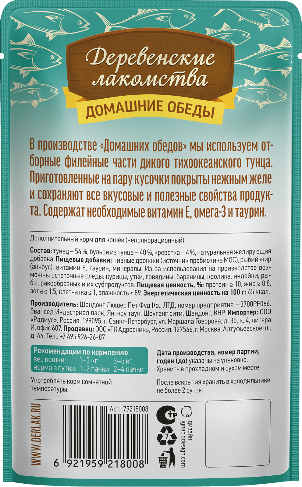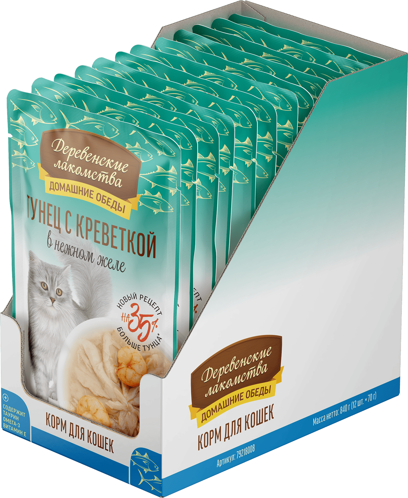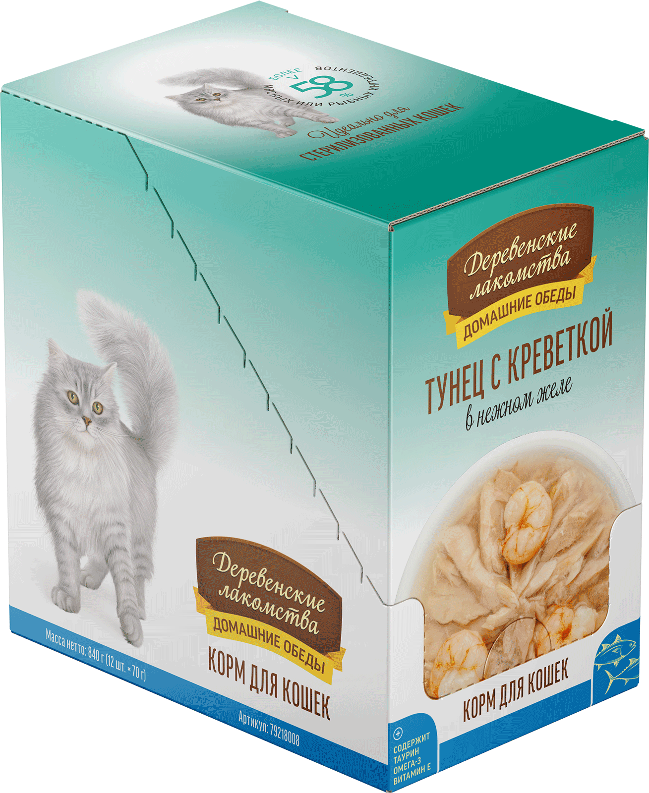 Состав: тунец 54 %, креветка 4 %, бульон из тунца 40 %, натуральная желирующая добавка.