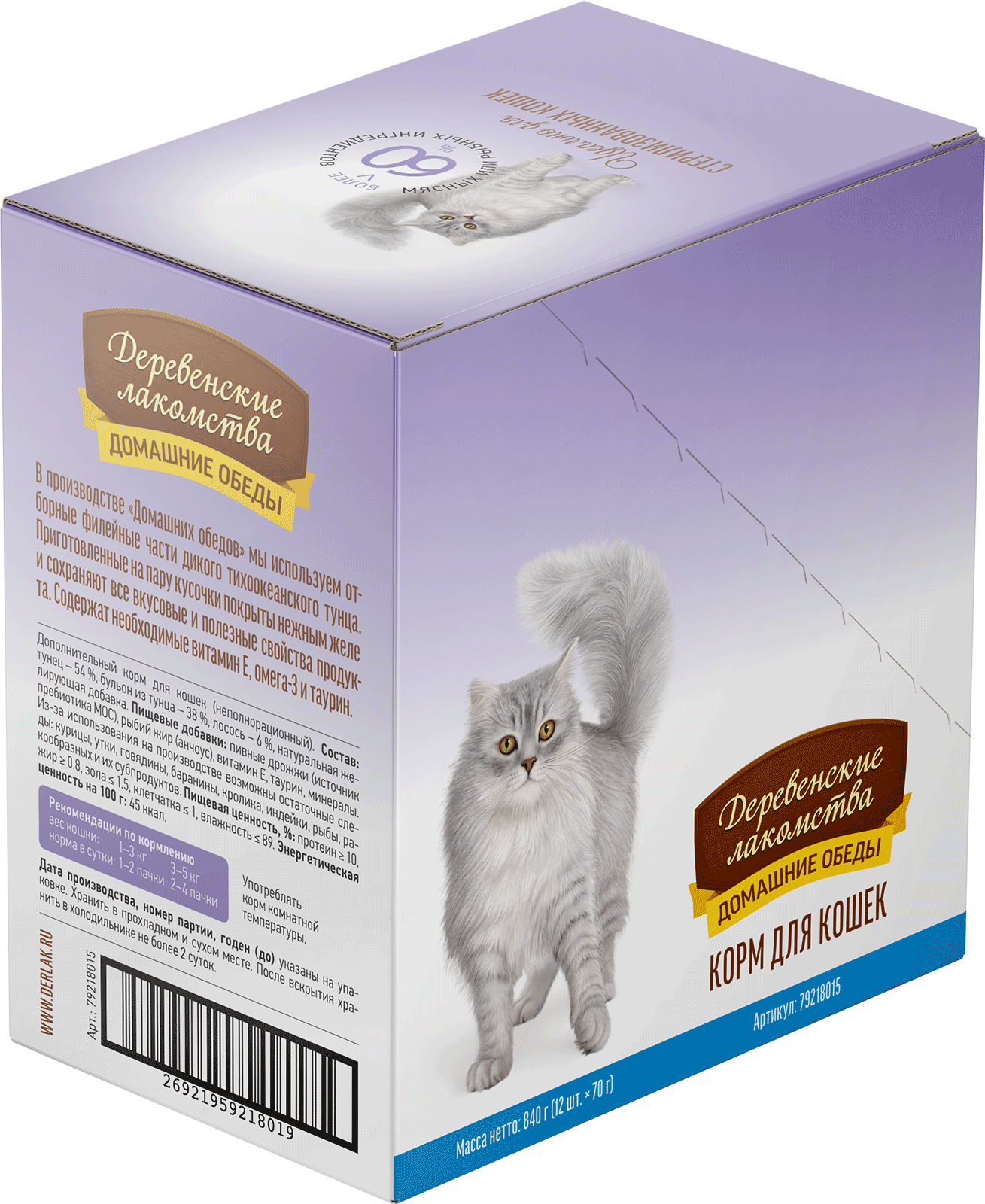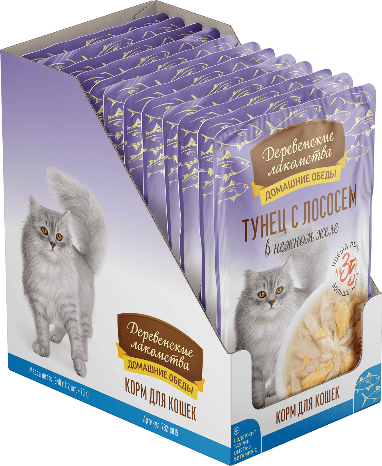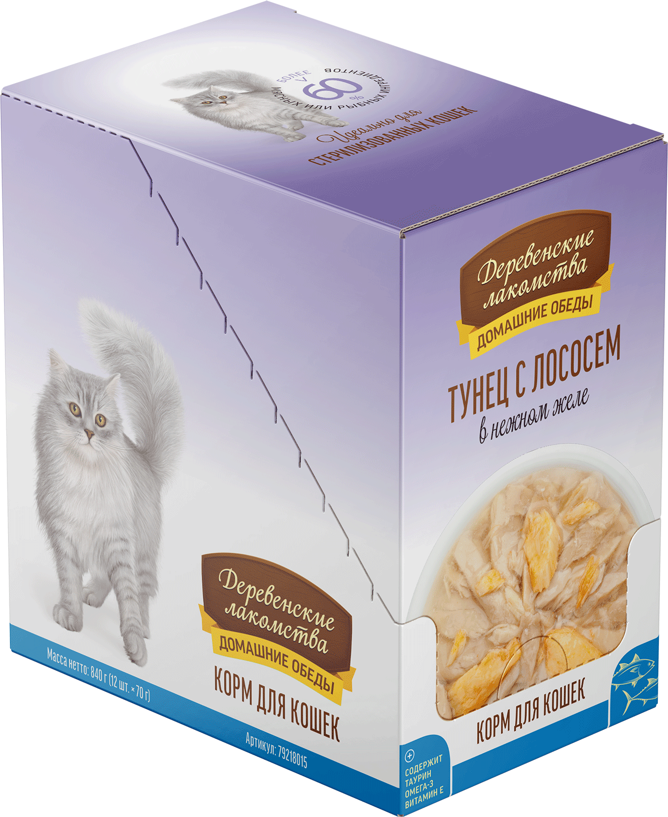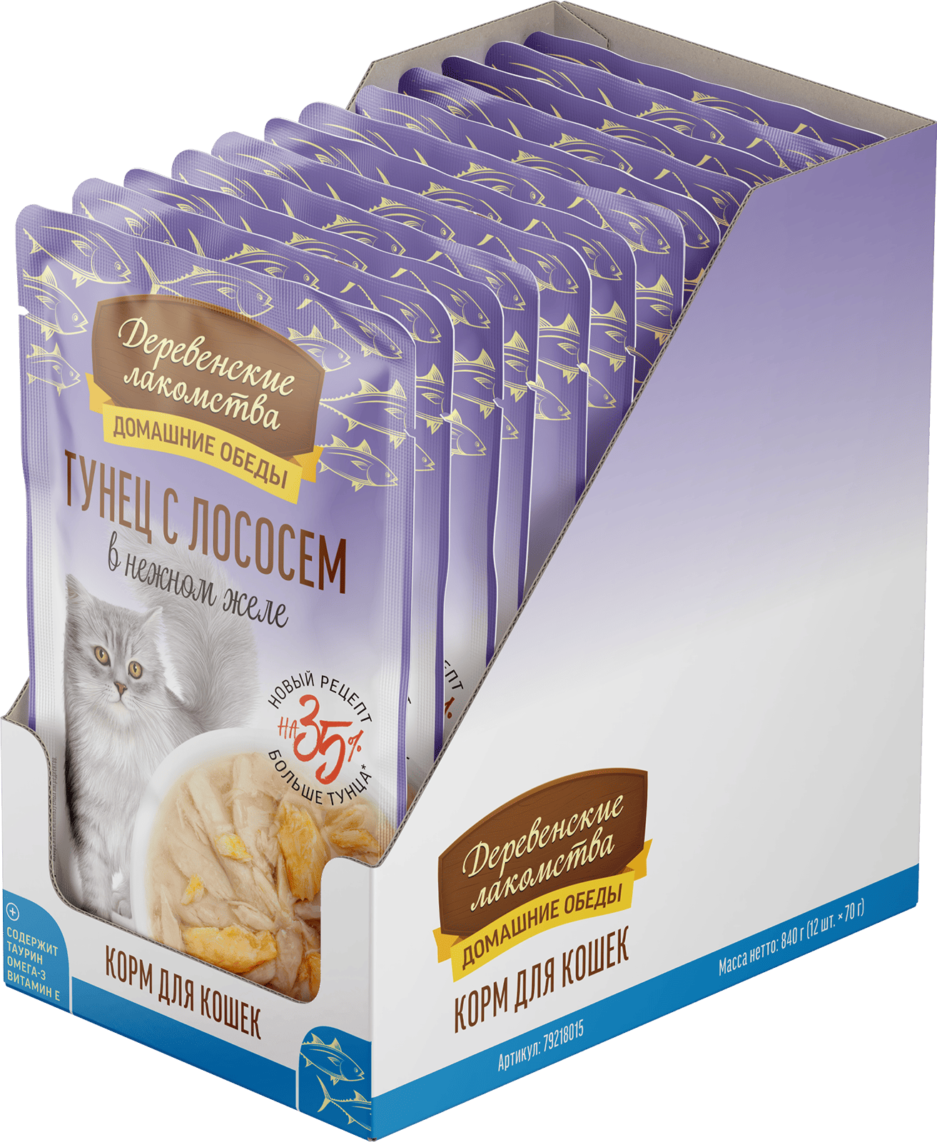 Консервированный влажный корм для кошек серии «Деревенские лакомства — Домашние обеды» из тунца и лосося приготовлен на пару, что позволяет максимально сохранить все ценные питательные вещества, включая Омега-3 жирные кислоты, необходимые для здоровья кожи и блестящей шерсти вашей кошки. Легкая текстура желе облегчает процесс потребления, делая этот продукт идеальным даже для самых привередливых питомцев. Побалуйте свою кошку изысканным и полезным лакомством!