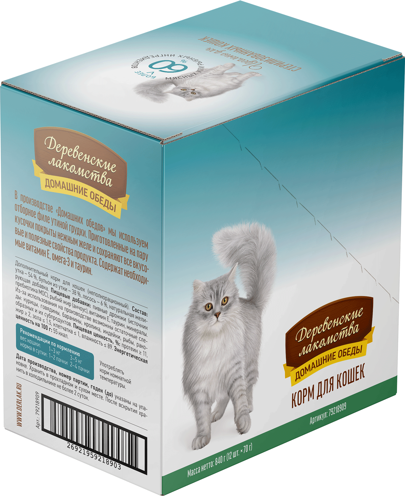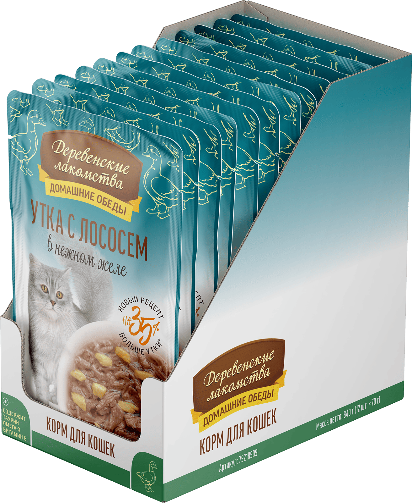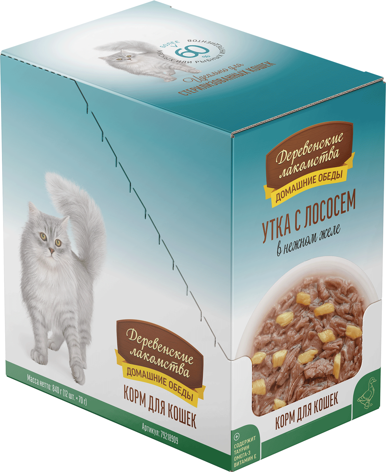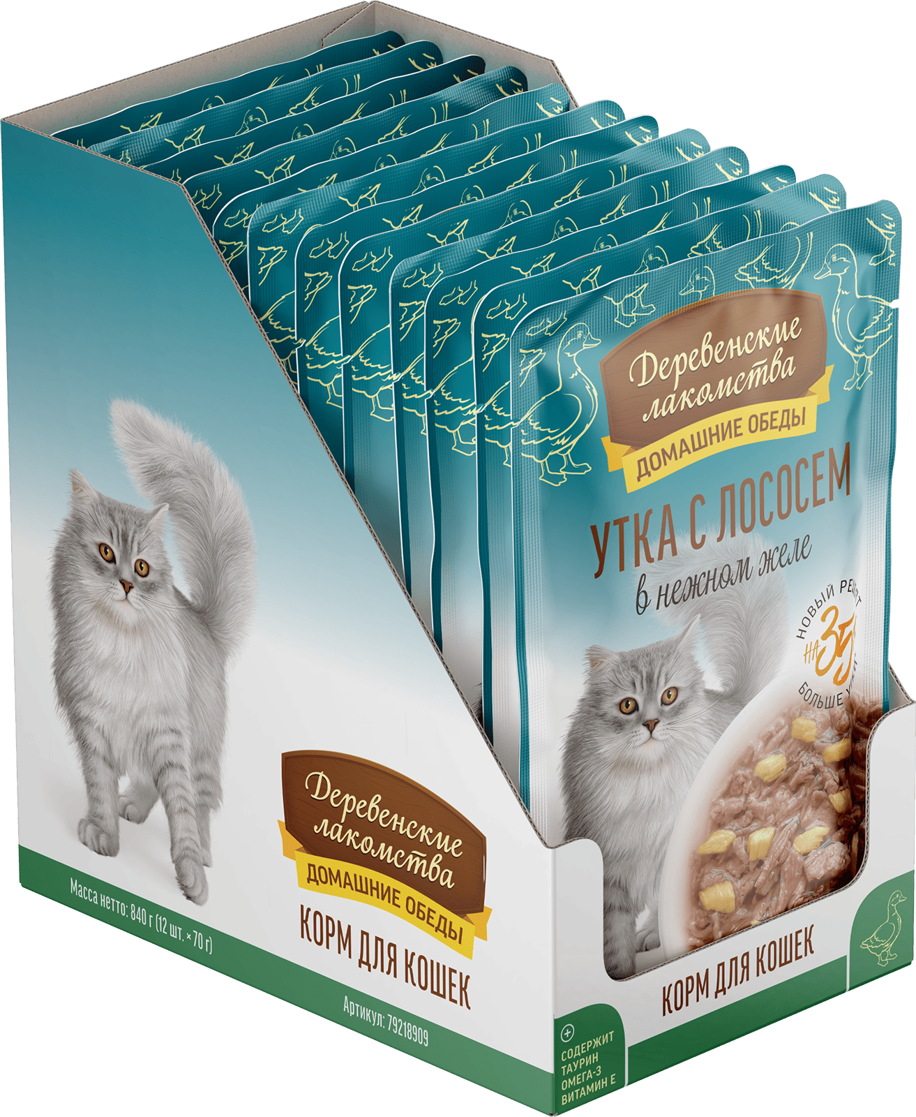 Консервированный влажный корм для кошек серии «Деревенские лакомства — Домашние обеды» из нежного мяса лосося и отборного утиного филе — гармоничное сочетание для пушистых любителей изысканных блюд, созданное специально для питомцев, ценящих гастрономическое разнообразие. Легкая текстура желе облегчает процесс потребления, делая этот продукт идеальным даже для самых привередливых питомцев.