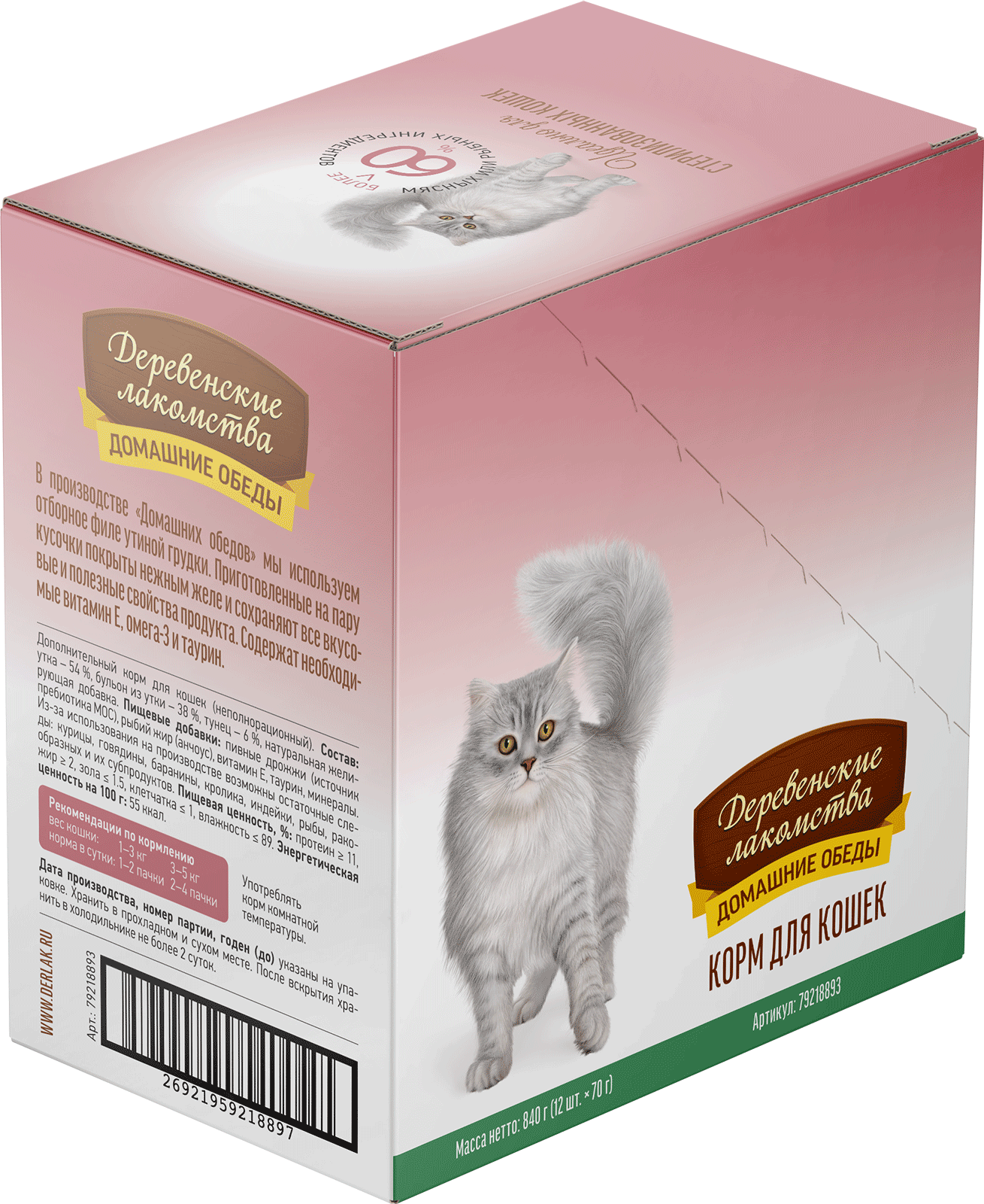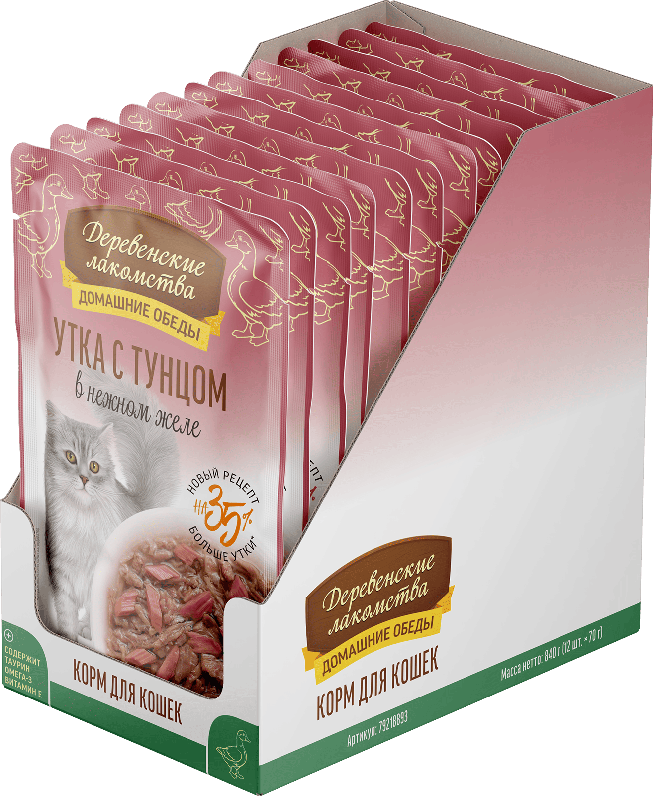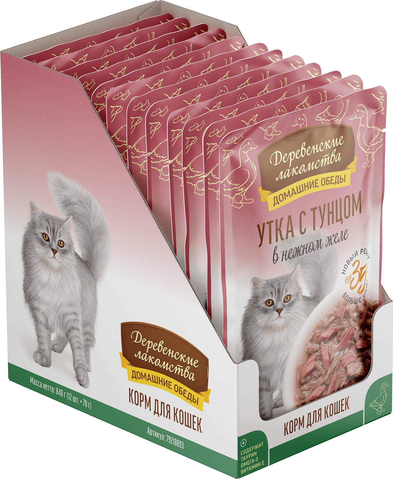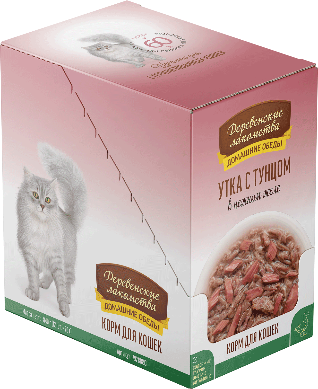Состав: утка 54 %, тунец 6 %, бульон из утки 38 %, натуральная желирующая добавка.