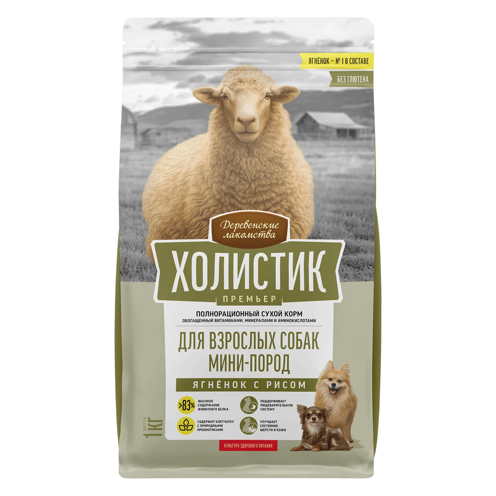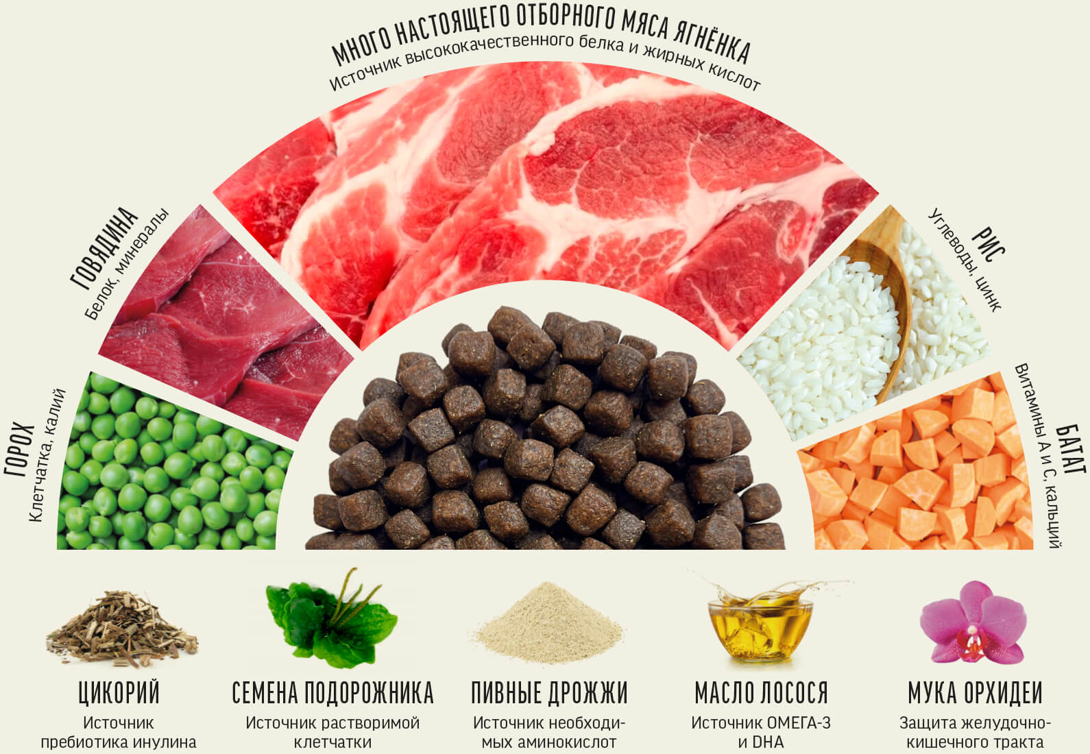 Дегидрированное мясо ягненка 35 %, рис, куриный жир, горох, дегидрированная говядина 7 %, сушёный батат, говяжий жир, тапиоковый крахмал, свежая утка 1 %, сушёные пивные дрожжи (источник пребиотика MOS), витаминно-минеральный комплекс (А, D3, E, B1, B2, B6, B12, ниацин (B3), холина хлорид, железо, медь, марганец, цинк, хлорид калия, L-лизин), гидролизат куриной печени, сушёные яблоки, сушёная груша, сушёная тыква, сельдерей, сушёный цикорий (источник инулина и пребиотика FOS), мука орхидеи, семена подорожника, ягоды годжи, масло лосося, сушёные морские водоросли.