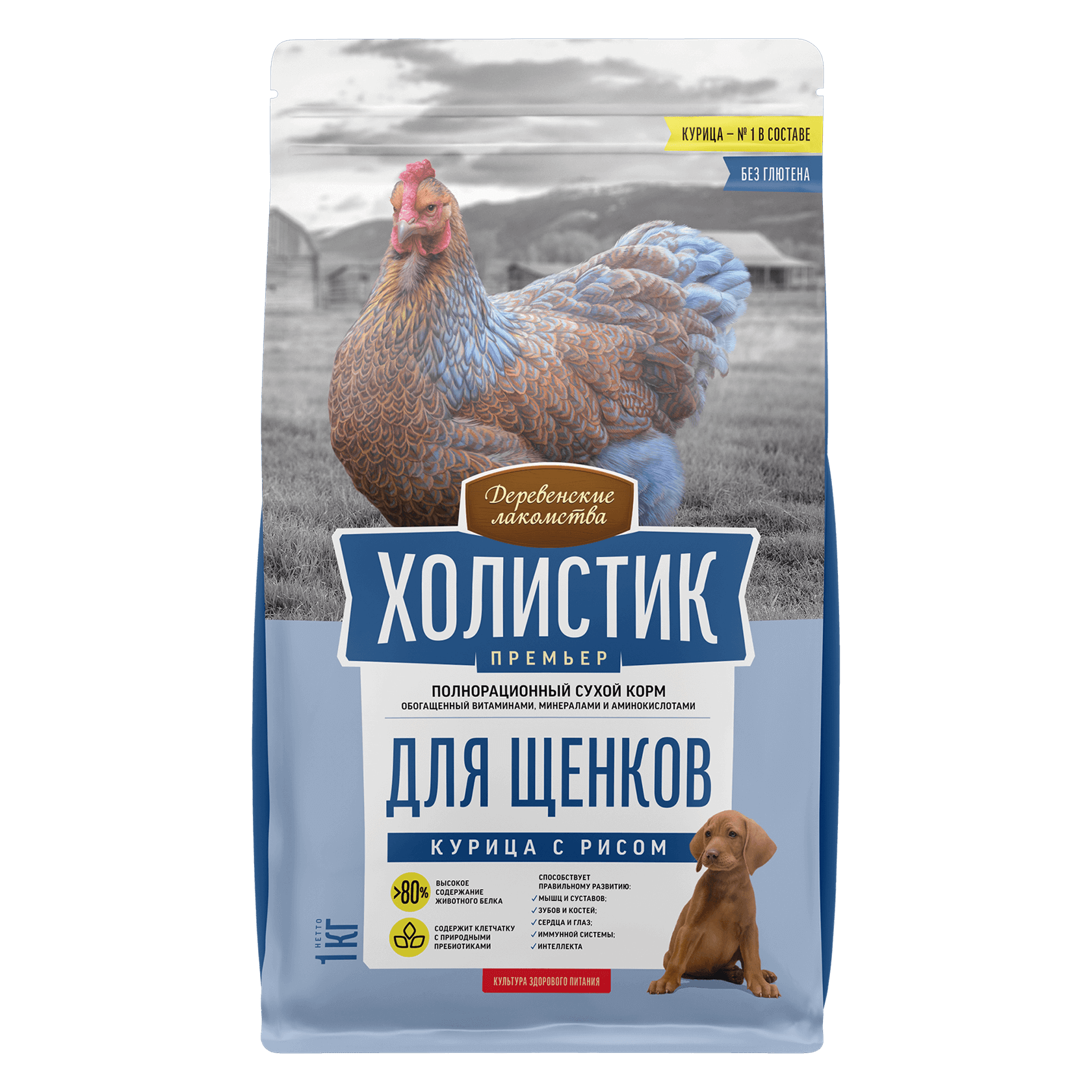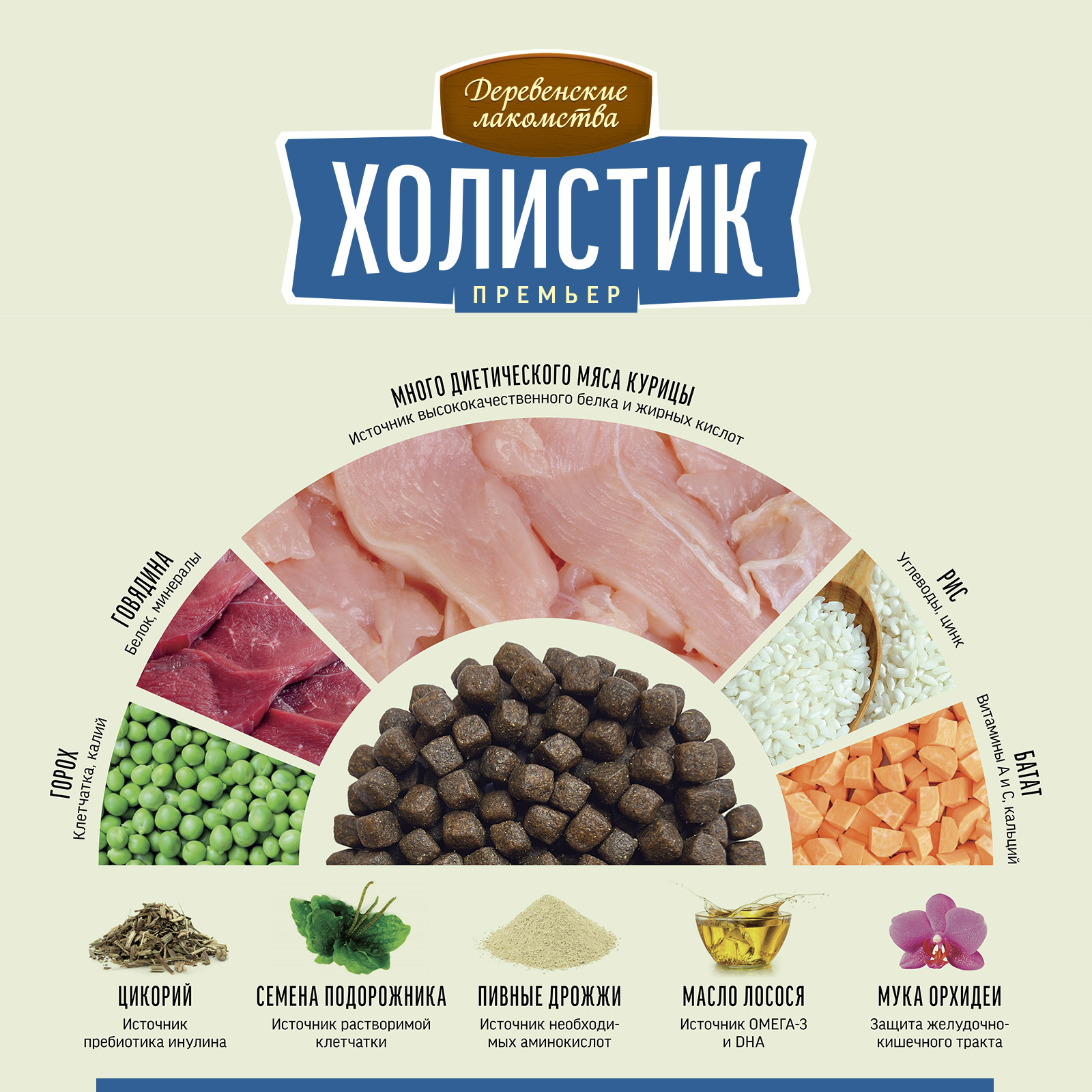Свежая курица 30 %, рис, горох, дегидрированная говядина 9 %, куриный жир, сушёный батат, говяжий жир, тапиоковый крахмал, свежая утка 1 %, сушёные пивные дрожжи (источник пребиотика MOS), витаминно-минеральный комплекс (А, D3, E, B1, B2, B6, B12, ниацин (B3), холина хлорид, железо, медь, марганец, цинк, хлорид калия, L-лизин), гидролизат куриной печени, сушёные яблоки, сушёная груша, сушёная тыква, сельдерей, сушёный цикорий (источник инулина и пребиотика FOS), мука орхидеи, козье молоко, семена подорожника, ягоды годжи, масло лосося, сушёные морские водоросли.