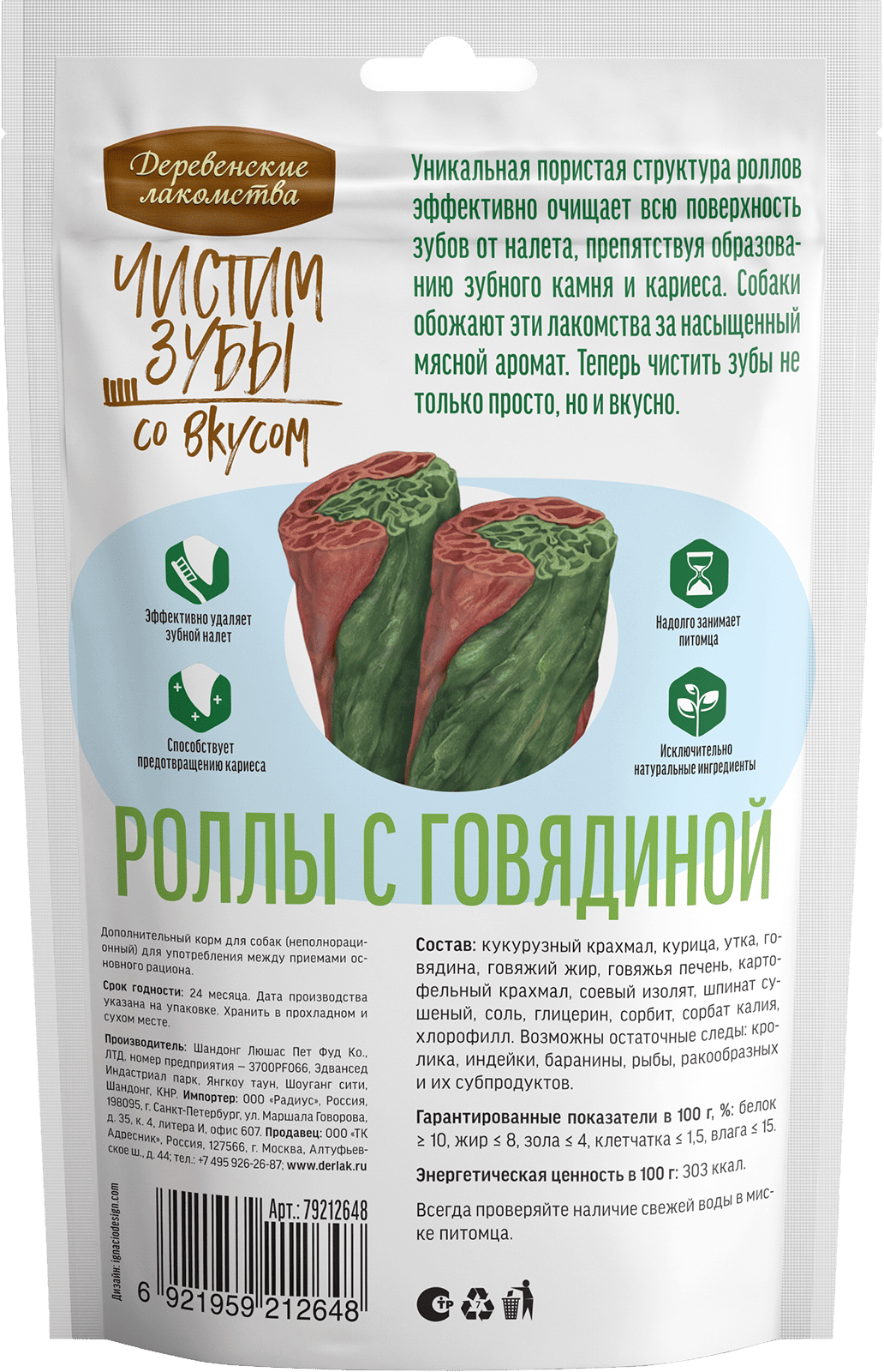 Уникальная пористая структура роллов с говядиной эффективно очищает всю поверхность зубов от налета, препятствуя образованию зубного камня и кариеса. Собаки обожают эти лакомства за насыщенный мясной аромат. Теперь чистить зубы не только просто, но и вкусно! Лакомство предназначено для взрослых собак всех пород.