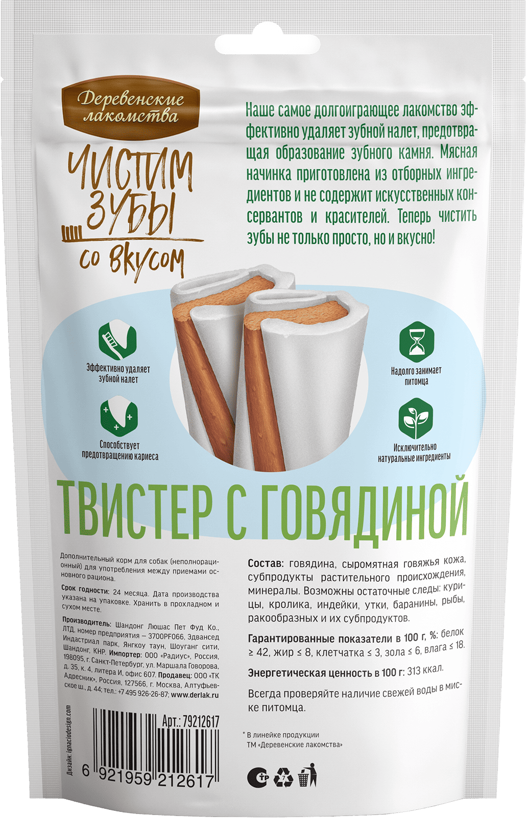 Твистер с говядиной для собак крупных пород — наше самое долгоиграющее лакомство. Эффективно удаляет зубной налет, предотвращая образование зубного камня. Мясная начинка приготовлена из отборных ингредиентов и не содержит искусственных консервантов и красителей. Теперь чистить зубы не только просто, но и вкусно!