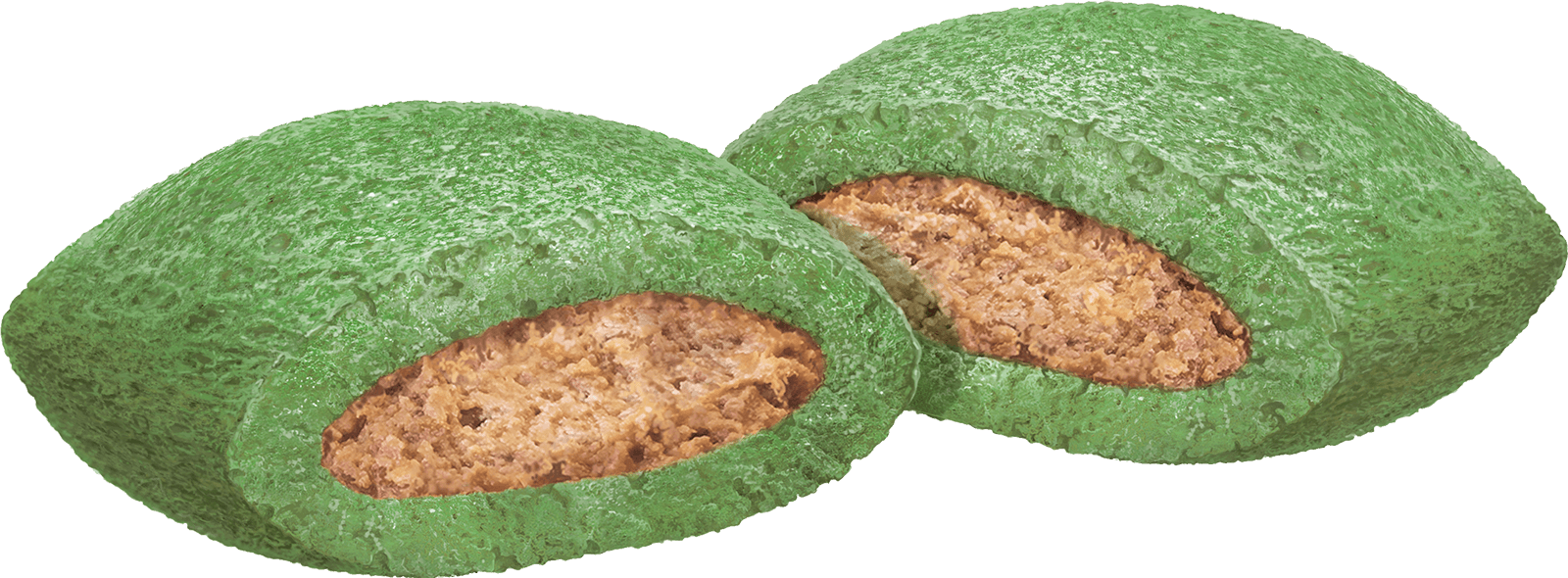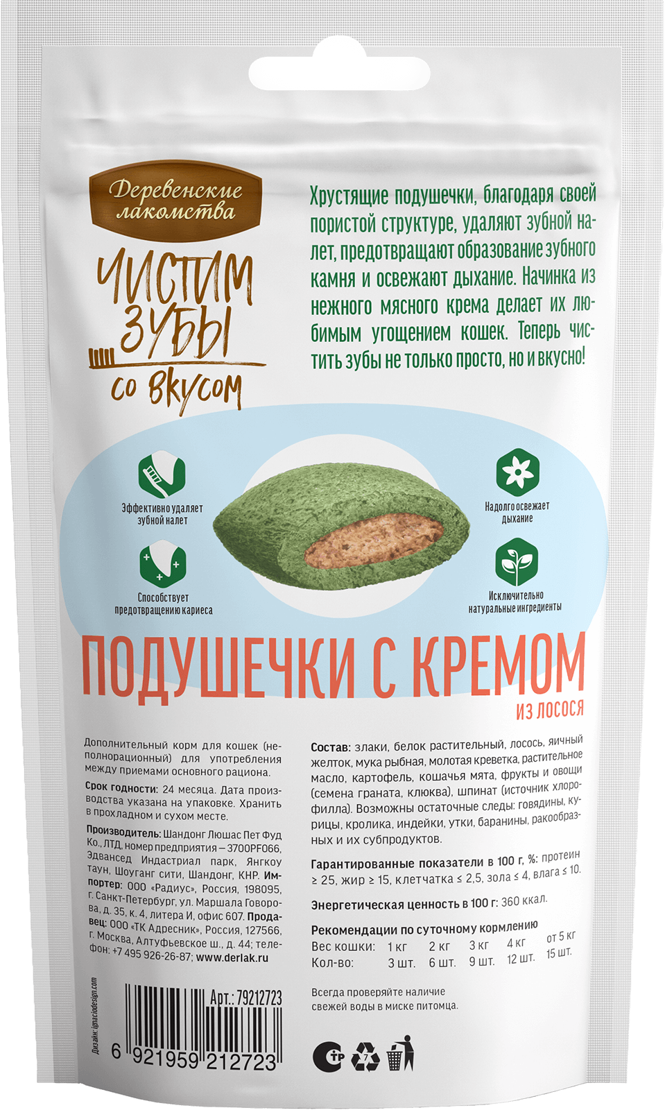 Хрустящие подушечки с кремом из лосося, благодаря своей пористой структуре, удаляют зубной налет, предотвращают образование зубного камня и освежают дыхание. Начинка из нежного рыбного крема делает их любимым угощением кошек. Теперь чистить зубы не только просто, но и вкусно!