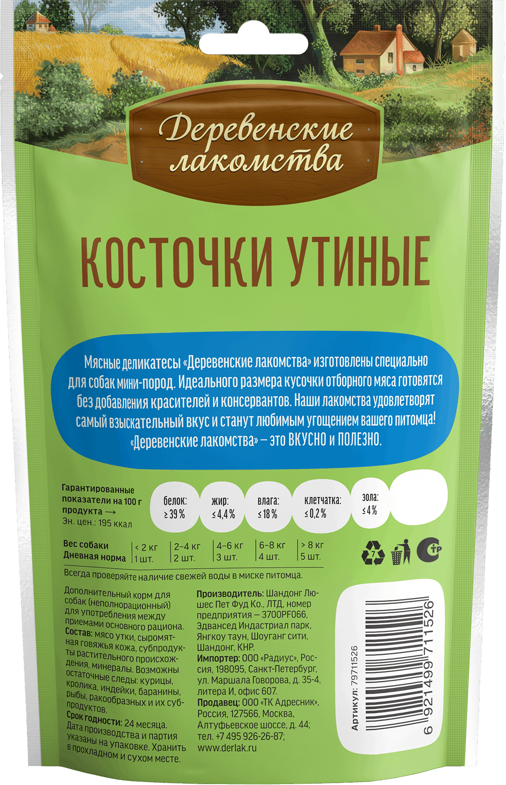 Состав: мясо утки, сыромятная говяжья кожа, субпродукты растительного происхождения, минералы.