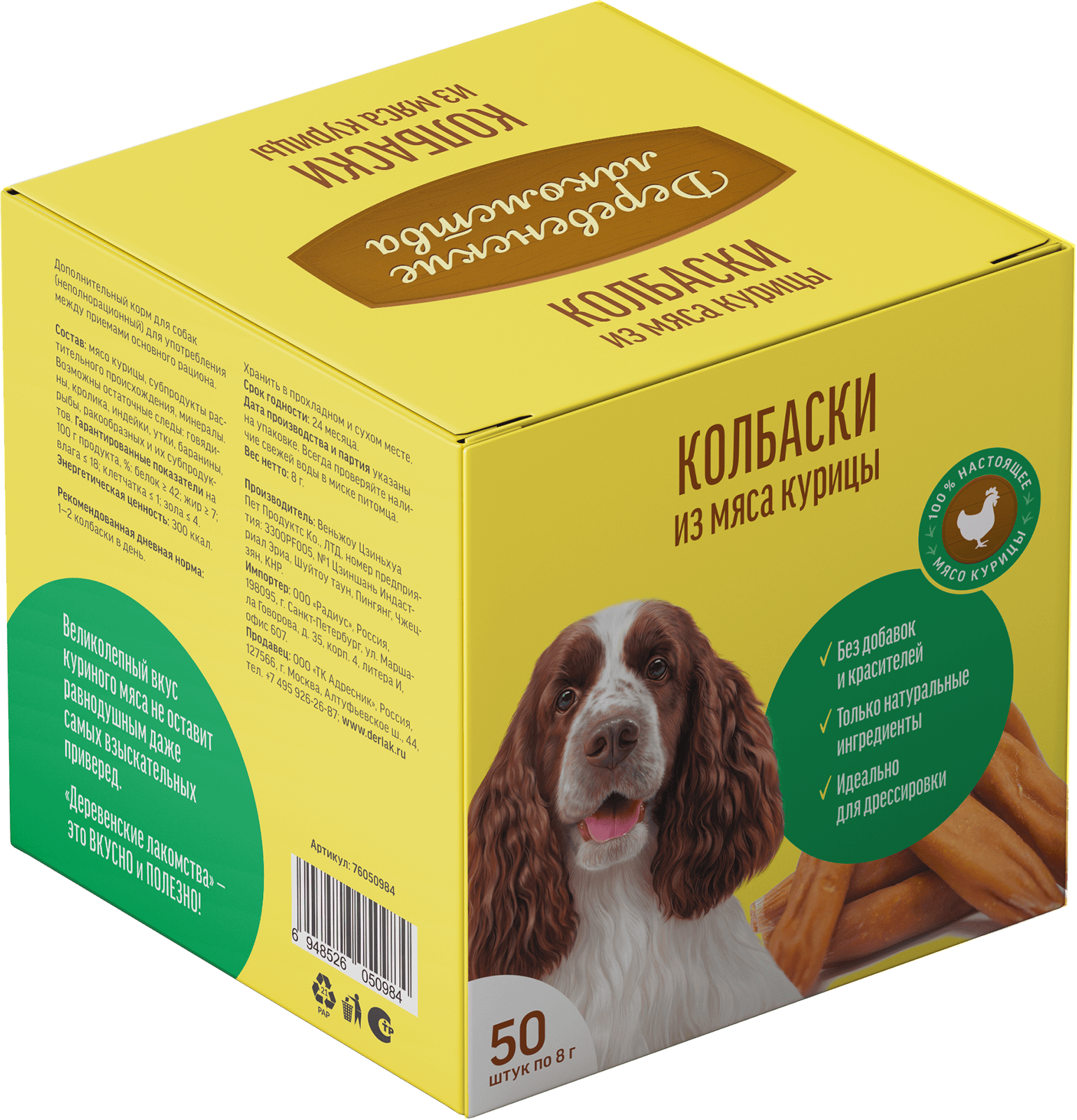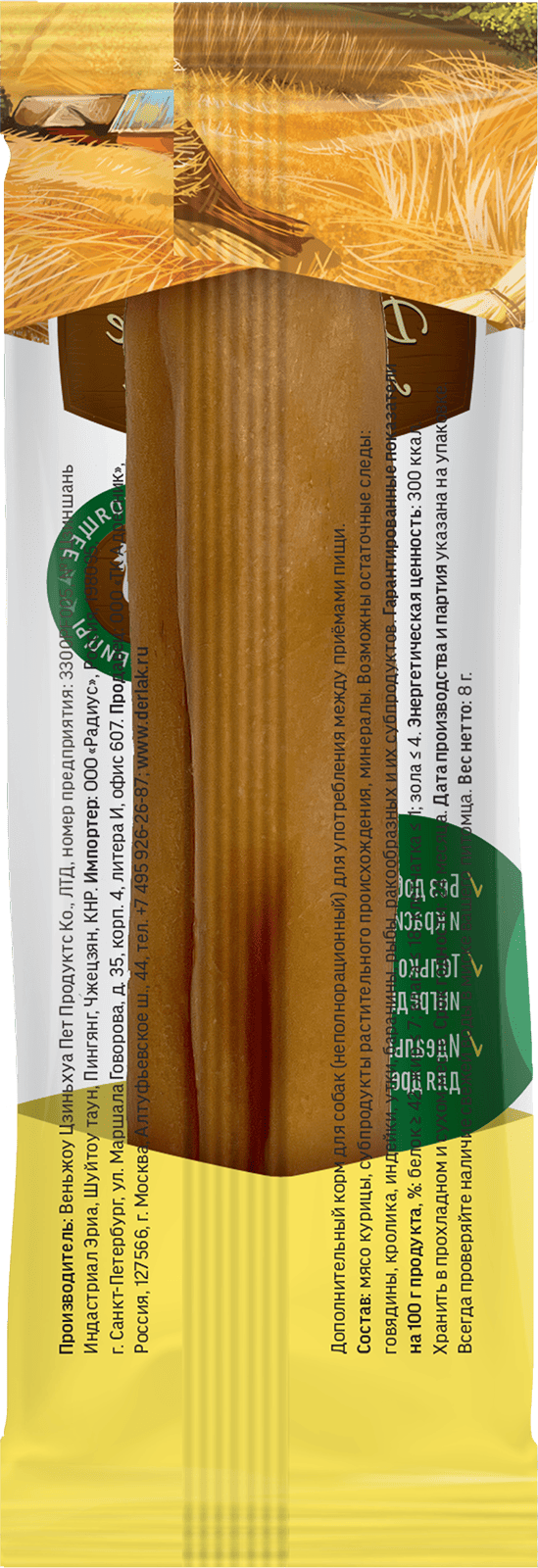 Каждая колбаска упакована в индивидуальную герметичную обертку. Такая упаковка очень удобна, ведь в данном случае вы можете использовать угощение для поощрения животного так часто, как это необходимо именно вам, и не бояться, что оставшиеся в открытом пакете лакомства потеряют свои свойства. Колбаски останутся свежими, сочными, очень вкусными и полезными не протяжении всего срока годности.