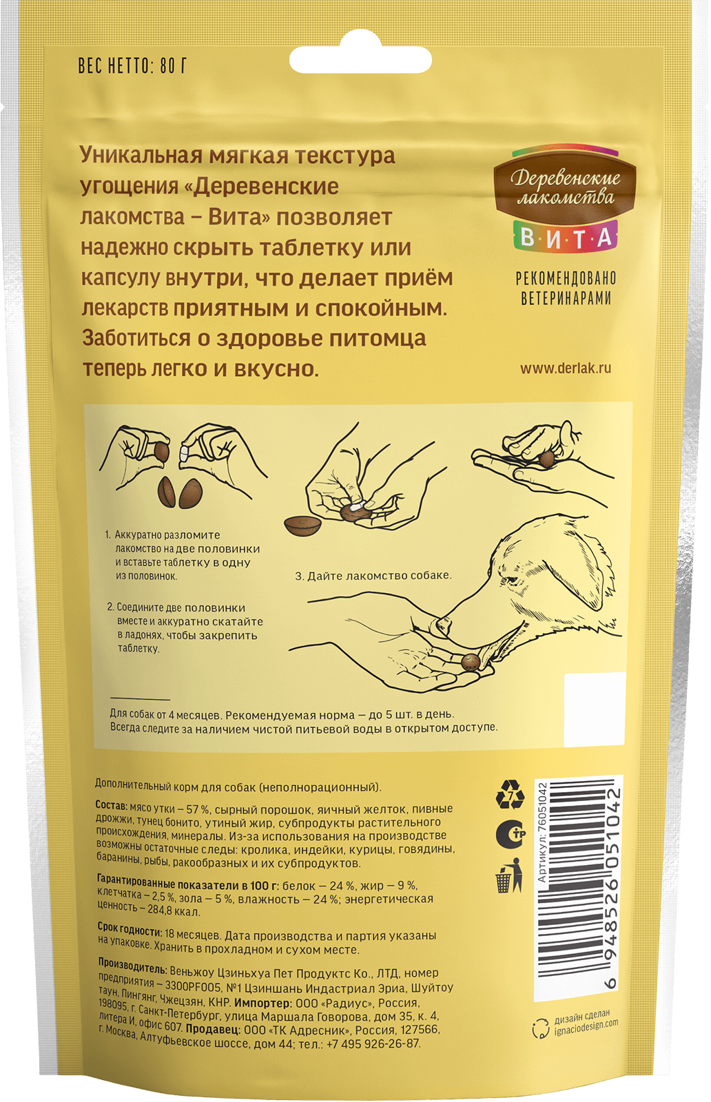 Функциональное угощение для собак из отборного мяса утки для удобного приема таблеток. Уникальная мягкая текстура угощения «Деревенские лакомства — Вита» позволяет надежно скрыть таблетку или капсулу внутри. Его восхитительный вкус и аромат отвлекут вашего питомца, а удобная текстура позволит легко спрятать лекарство. Теперь забота о здоровье станет проще и приятнее!