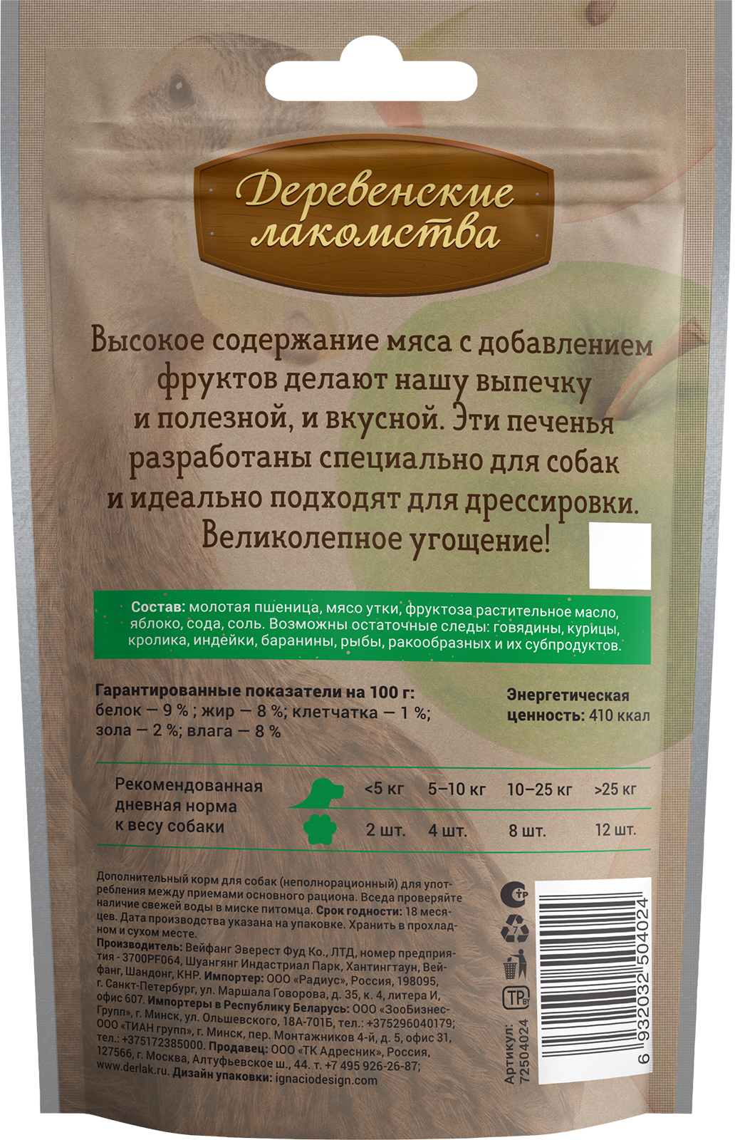 Состав: молотая пшеница, мясо утки, яблоко; натуральные пищевые добавки: фруктоза, растительное масло, сода, соль.