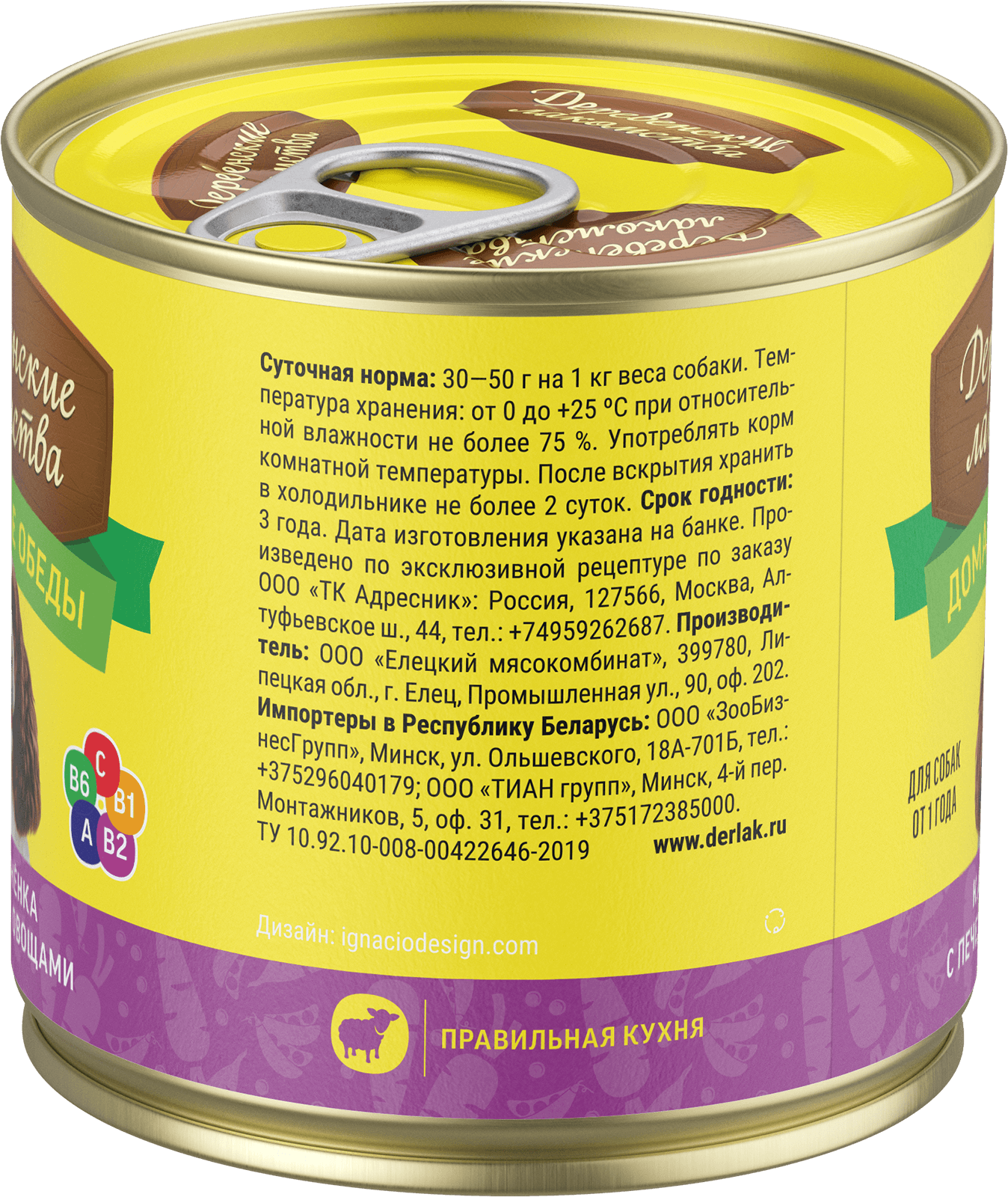 Состав: ягненок, печень говяжья, субпродукты мясные, морковь, зелёный горошек, растительное масло, желирующая добавка, соль, вода.