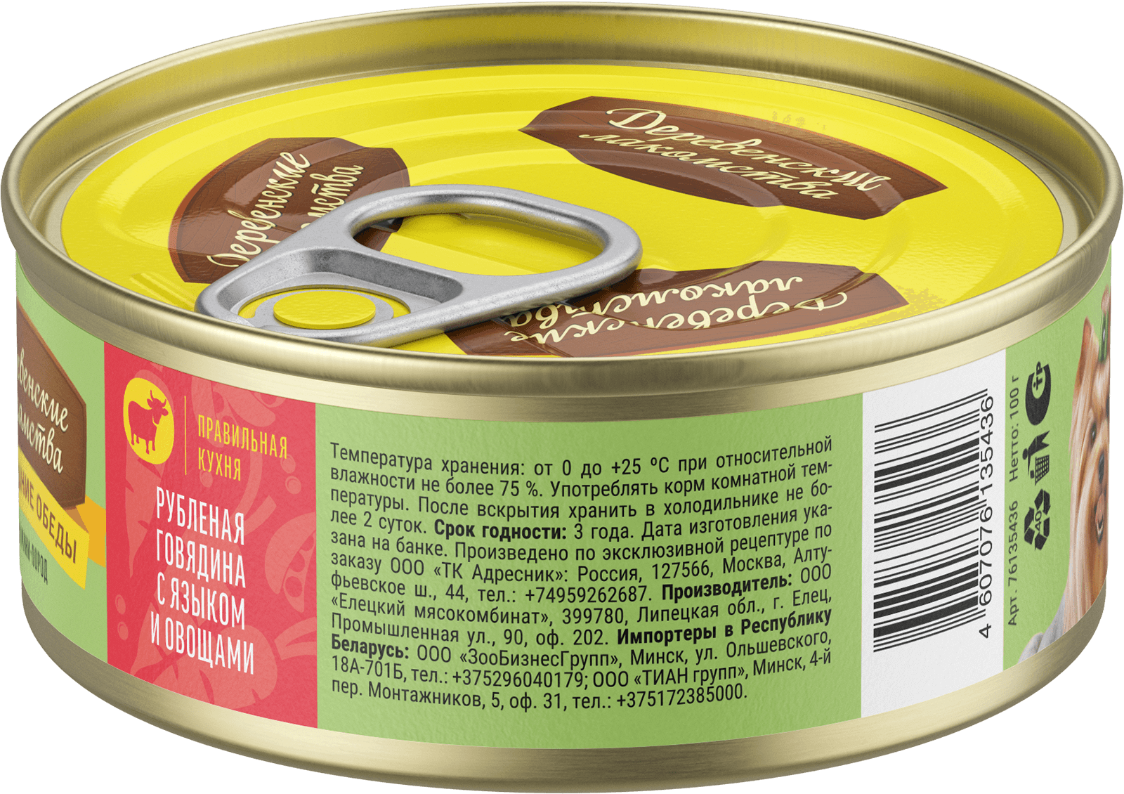 Состав: говядина, язык говяжий, субпродукты мясные, морковь, зелёный горошек, растительное масло, желирующая добавка, соль, вода.