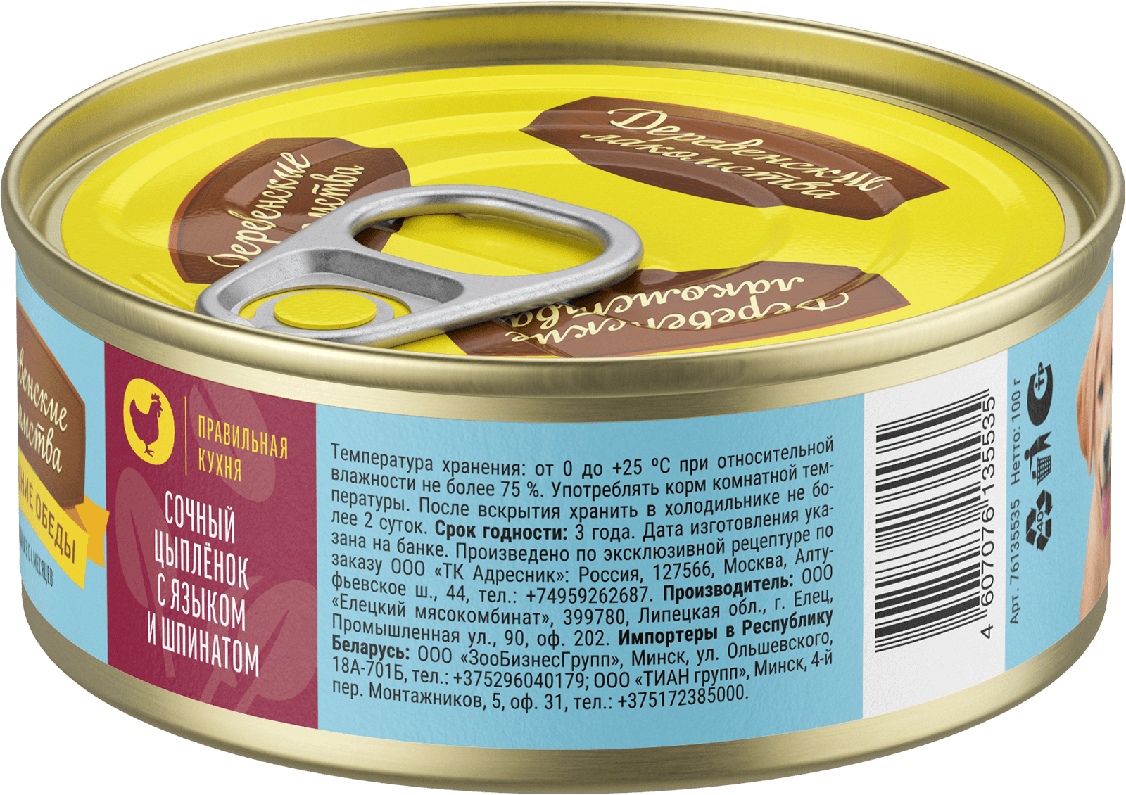 Состав: цыплёнок, язык говяжий, субпродукты мясные, растительное масло, желирующая добавка, соль, вода.